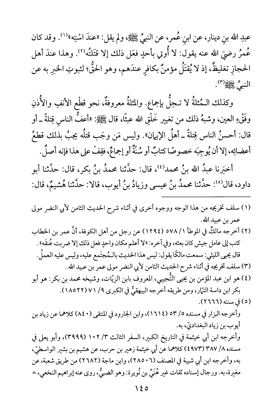 (¬٤) هو ابن عبد المؤمن بن يحيى التُّجيبي، المعروف بابن الزيّات، وشيخه محمد بن بكر: هو أبو بكر ابن داسة التمّار، ومن طريقه أخرجه البيهقيُّ في الكبرى ٩/ ٧١ (١٨٥٢٢).