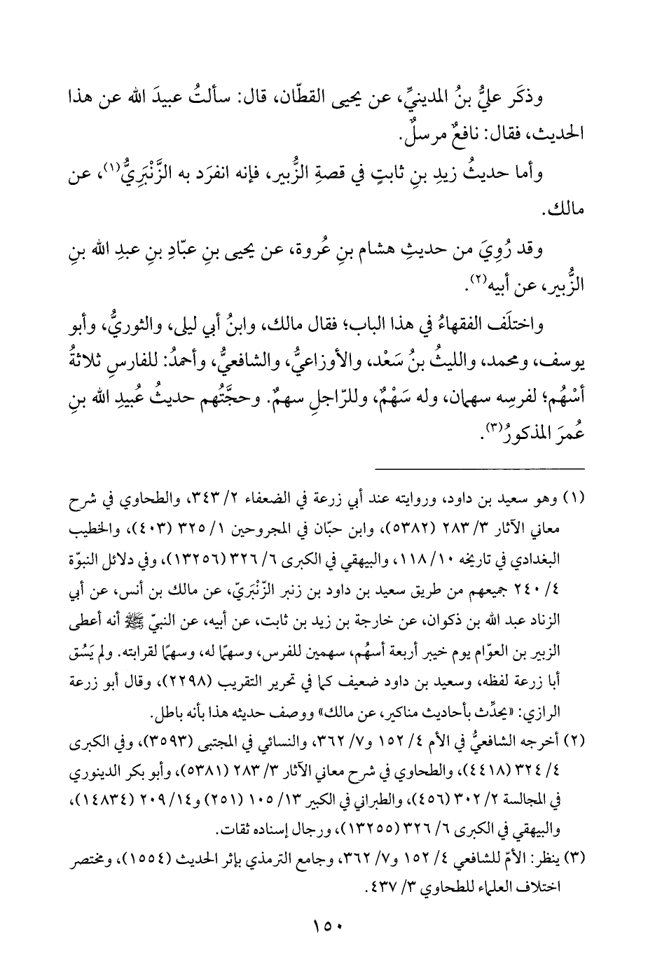 (¬١) وهو سعيد بن داود، وروايته عند أبي زرعة في الضعفاء ٢/ ٣٤٣، والطحاوي في شرح معاني الآثار ٣/ ٢٨٣ (٥٣٨٢)، وابن حبّان في المجروحين ١/ ٣٢٥ (٤٠٣)، والخطيب البغدادي في تاريخه ١٠/ ١١٨، والبيهقي في الكبرى ٦/ ٣٢٦ (١٣٢٥٦)، وفي دلائل النبوّة ٤/ ٢٤٠ جميعهم من طريق سعيد بن داود بن زنبر الزّنْبَريّ، عن مالك بن أنس، عن أبي الزناد عبد الله بن ذكوان، عن خارجة بن زيد بن ثابت، عن أبيه، عن النبيّ -صلى الله عليه وسلم- أنه أعطى الزبير بن العوّام يوم خيبر أربعة أسهُم، سهمين للفرس، وسهمًا له، وسهمًا لقرابته. ولم يَسُق أبا زرعة لفظه، وسعيد بن داود ضعيف كما في تحرير التقريب (٢٢٩٨)، وقال أبو زرعة الرازي: "يحدِّث بأحاديث مناكير، عن مالك" ووصف حديثه هذا بأنه باطل.
