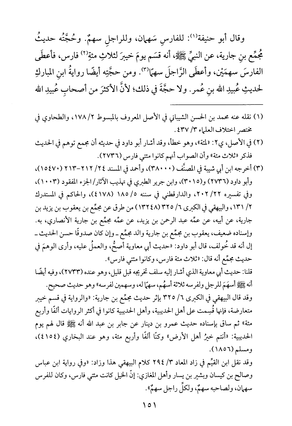 وقال أبو حنيفة (¬١): للفارسِ سَهمان، وللراجلِ سهمٌ. وحُجَّتُه حديثُ مجُمِّع بنِ جارية، عن النبيِّ -صلى الله عليه وسلم-، أنه قسَم يومَ خيبرَ لثلاثِ مئةِ (¬٢) فارس، فأعطَى الفارسَ سهمَيْن، وأعطَى الرَّاجلَ سهمًا (¬٣). ومن حجَّتِه أيضًا روايةُ ابنِ المباركِ لحديثِ عُبيدِ الله بنِ عُمر. ولا حجَّةَ في ذلك؛ لأنَّ الأكثرَ من أصحابِ عُبيدِ الله