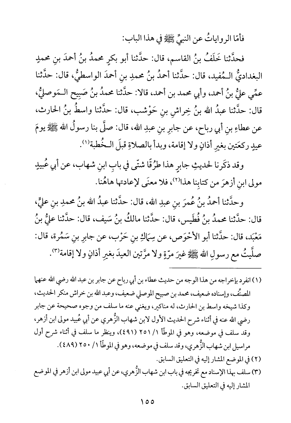 وحدَّثنا أحمدُ بنُ عُمرَ بنِ عبدِ الله، قال: حدَّثنا عبدُ الله بنُ محمدِ بنِ عليٍّ، قال: حدَّثنا محمدُ بنُ فُطَيس، قال: حدَّثنا مالكُ بنُ سَيف، قال: حدَّثنا عليُّ بنُ مَعْبَد، قال: حدَّثنا أبو الأحْوَص، عن سِمَاكِ بنِ حَرْب، عن جابرِ بنِ سَمُرة، قال: صلَّيتُ مع رسولِ الله -صلى الله عليه وسلم- غيرَ مرّةٍ ولا مرَّتين العيدَ بغيرِ أذانٍ ولا إقامة (¬٣).