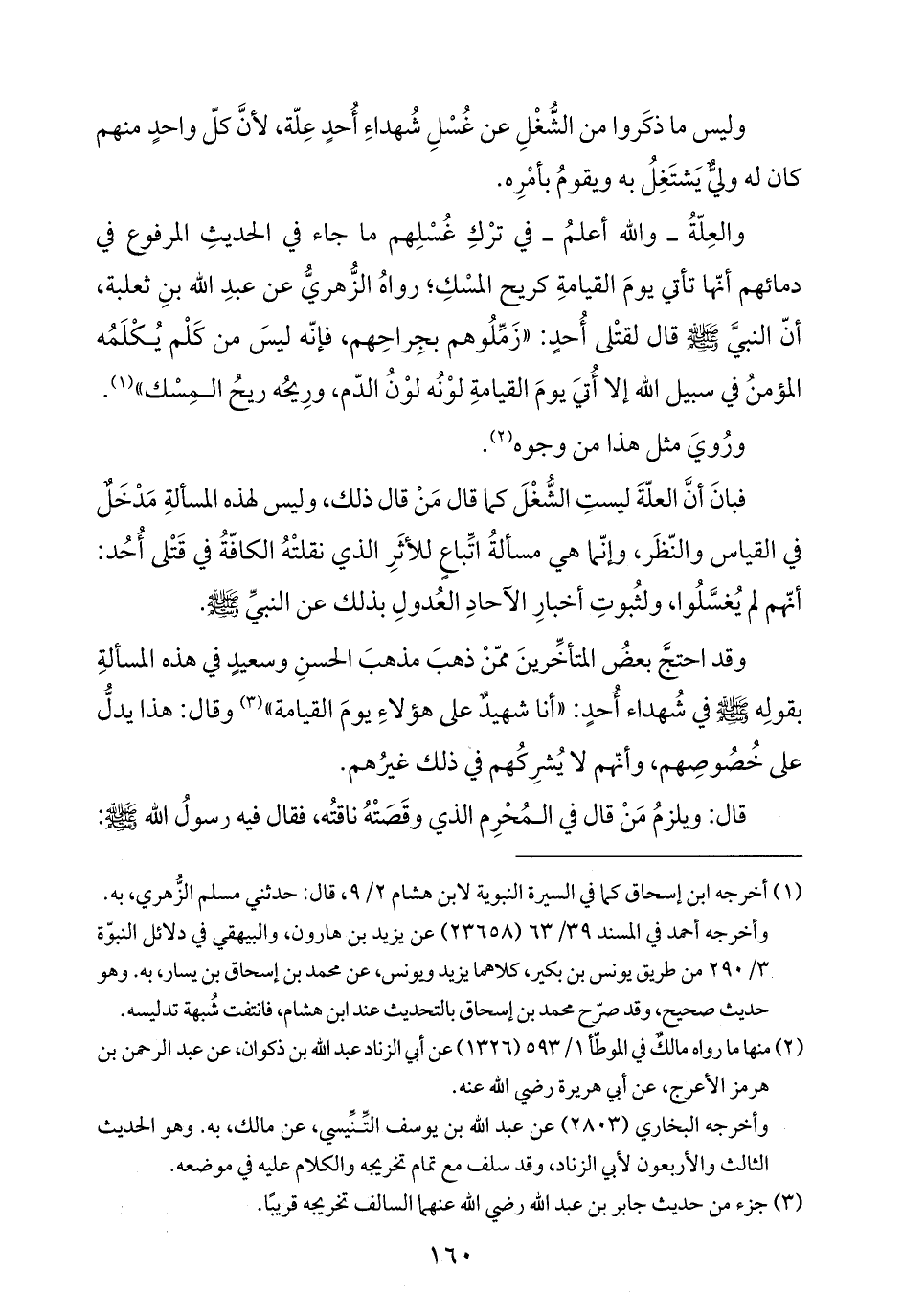 وليس ما ذكَروا من الشُّغْلِ عن غُسْلِ شُهداءِ أُحدٍ عِلّة، لأنَّ كلّ واحدٍ منهم كان له وليٌّ يَشتَغِلُ به ويقومُ بأمْرِه.