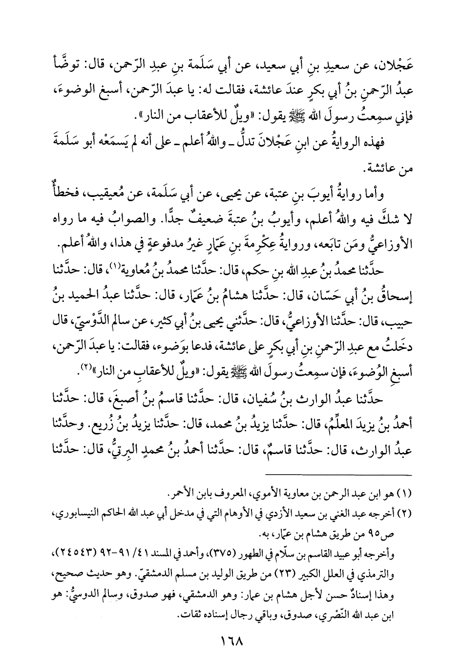 حدَّثنا محمدُ بنُ عبدِ الله بنِ حكم، قال: حدَّثنا محمدُ بنُ مُعاوية (¬١)، قال: حدَّثنا إسحاقُ بنُ أبي حَسّان، قال: حدَّثنا هشامُ بنُ عَمّار، قال: حدَّثنا عبدُ الحميد بنُ حبيب، قال: حدَّثنا الأوزاعيُّ، قال: حدَّثني يحيى بنُ أبي كثير، عن سالم الدَّوْسيّ، قال دخَلتُ مع عبدِ الرّحمنِ بنِ أبي بكرٍ على عائشة، فدعا بوَضوء، فقالت: يا عبدَ الرّحمن، أسبغِ الوُضوءَ، فإن سمِعتُ رسولَ الله -صلى الله عليه وسلم- يقول: "ويلٌ للأعقابِ من النار" (¬٢).