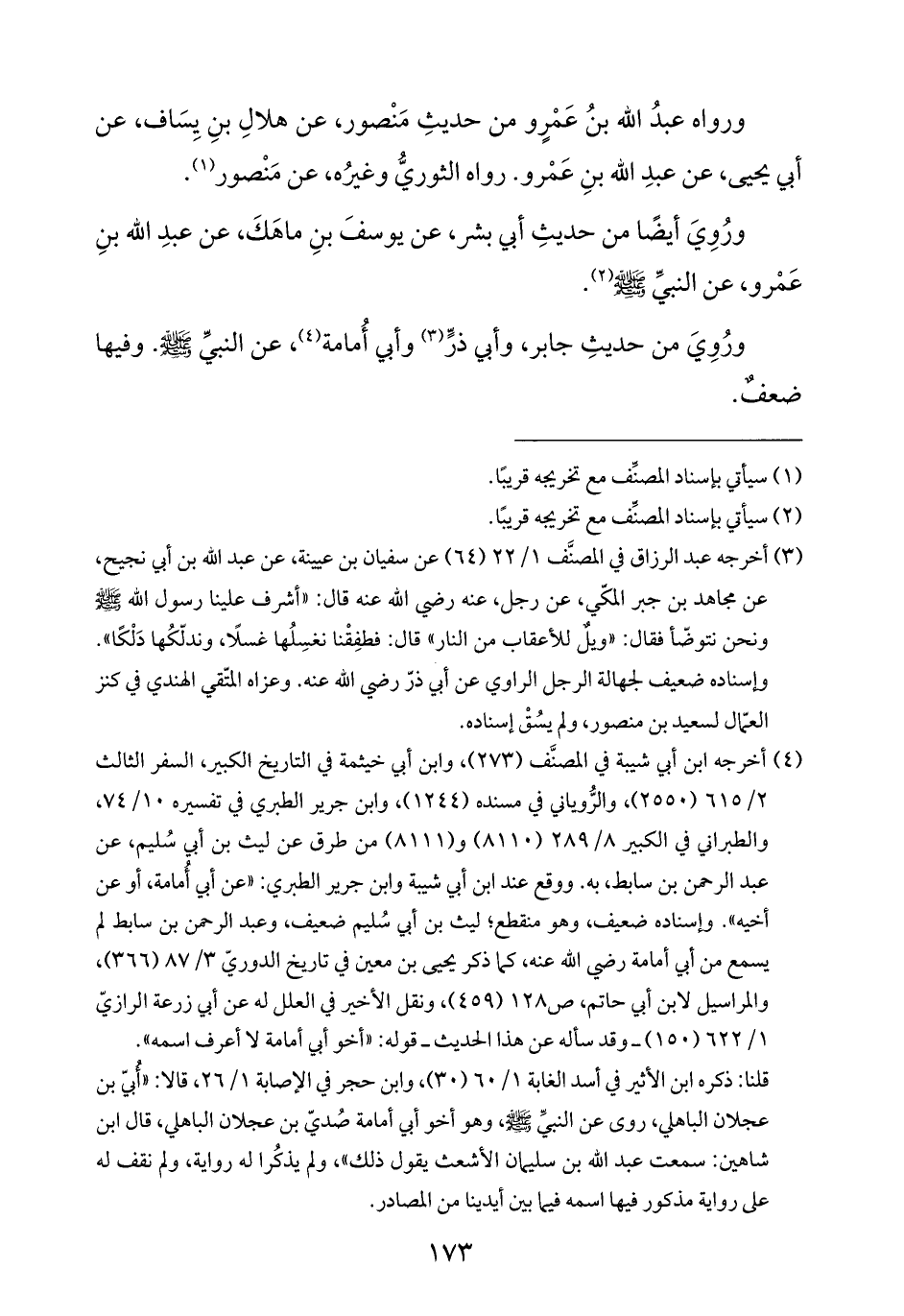 وإسناده ضعيف لجهالة الرجل الراوي عن أبي ذرّ رضي الله عنه. وعزاه المتّقي الهندي في كنز العمّال لسعيد بن منصور، ولم يسُقْ إسناده.
