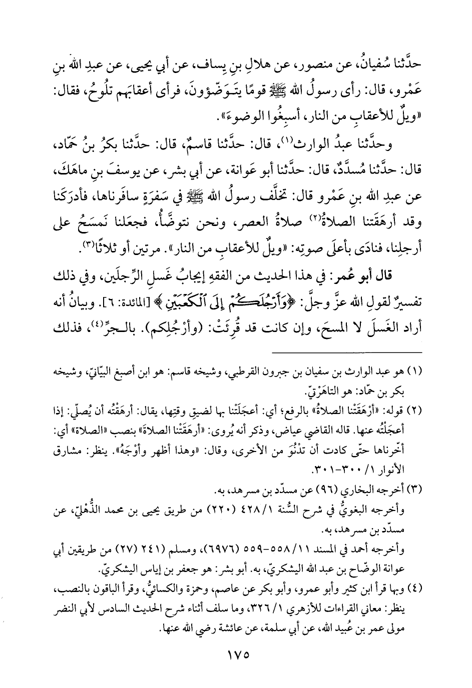 وحدَّثنا عبدُ الوارث (¬١)، قال: حدَّثنا قاسمٌ، قال: حدَّثنا بكرُ بنُ حَمّاد، قال: حدَّثنا مُسدَّدٌ، قال: حدَّثنا أبو عَوانة، عن أبي بشر، عن يوسفَ بنِ ماهَكَ، عن عبدِ الله بنِ عَمْرو قال: تخلَّف رسولُ الله -صلى الله عليه وسلم- في سَفرَةٍ سافَرناها، فأدرَكَنا وقد أرهَقَتنا الصلاةُ (¬٢) صلاةُ العصر، ونحن نتوضَأُ، فجعَلنا نَمسَحُ على أرجلِنا، فنادَى بأعلَى صوتِه: "ويلٌ للأعقابِ من النار". مرتين أو ثلاثًا (¬٣).