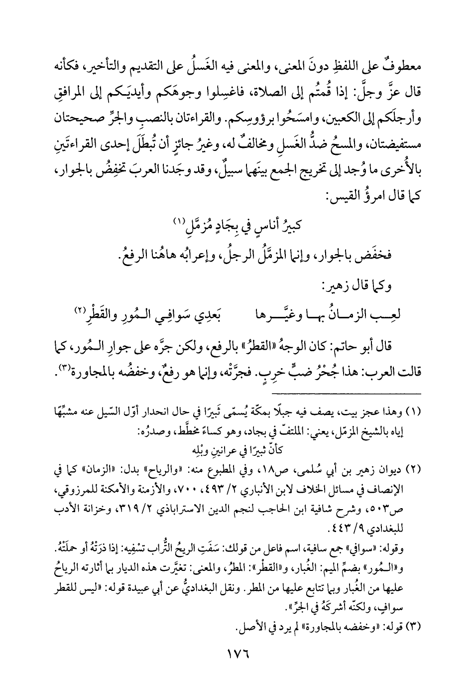 معطوفٌ على اللفظِ دونَ المعنى، والمعنى فيه الغَسلُ على التقديم والتأخير، فكأنه قال عزَّ وجلَّ: إذا قُمتُم إلى الصلاة، فاغسِلوا وجوهَكم وأيديَكم إلى المرافقِ وأرجلَكم إلى الكعبين، وامسَحُوا برؤوسِكم. والقراءتان بالنصبِ والجرِّ صحيحتان مستفيضتان، والمسحُ ضدُّ الغَسلِ ومخالفٌ له، وغيرُ جائزٍ أن تُبطَلَ إحدى القراءتَينِ بالأُخرى ما وُجد إلى تخريج الجمع بينَهما سبيلٌ، وقد وجَدنا العربَ تخفِضُ بالجوار، كما قال امرؤُ القيس: