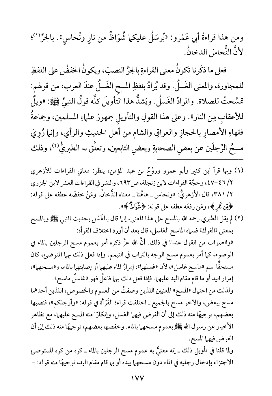 فعلى ما ذكَرنا تكونُ معنى القراءةِ بالجرِّ النصبَ، ويكونُ الخفضُ على اللفظِ للمجاورة، والمعنى الغَسلُ. وقد يُرادُ بلفظِ المسحِ الغَسلُ عندَ العرب، من قولهم: تمسَّحتُ للصلاة. والمرادُ الغَسلُ. ويَشدُّ هذا التأويلَ كلَّه قولُ النبيِّ -صلى الله عليه وسلم-: "ويلٌ للأعقابِ مِن النار". وعلى هذا القولِ والتأويلِ جمهورُ علماءِ المسلمين، وجماعةُ فقهاءِ الأمصارِ بالحجازِ والعراقِ والشام من أهل الحديثِ والرأي، وإنما رُوِيَ مسحُ الرِّجلَين عن بعضِ الصحابةِ وبعضِ التابعين، وتعلَّق به الطبريُّ (¬٢)، وذلك