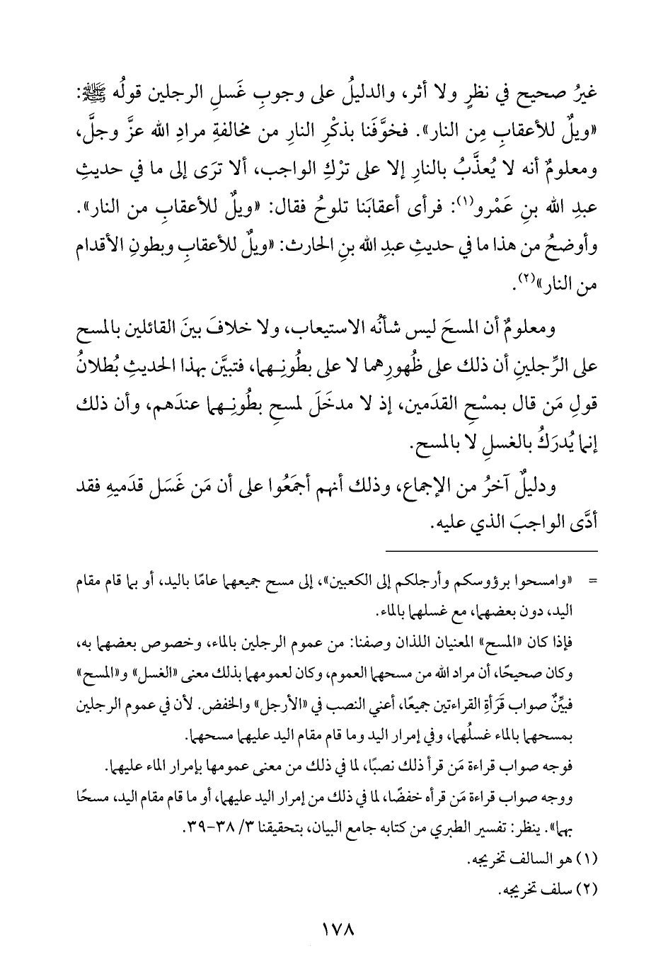 غيرُ صحيح في نظرٍ ولا أثر، والدليلُ على وجوبِ غَسلِ الرجلين قولُه -صلى الله عليه وسلم-: "ويلٌ للأعقابِ مِن النار". فخوَّفَنا بذكْرِ النارِ من مخالفةِ مرادِ الله عزَّ وجلَّ، ومعلومٌ أنه لا يُعذَّبُ بالنارِ إلا على ترْكِ الواجب، ألا ترَى إلى ما في حديثِ عبدِ الله بنِ عَمْرو (¬١): فرأى أعقابَنا تلوحُ فقال: "ويلٌ للأعقابِ من النار".