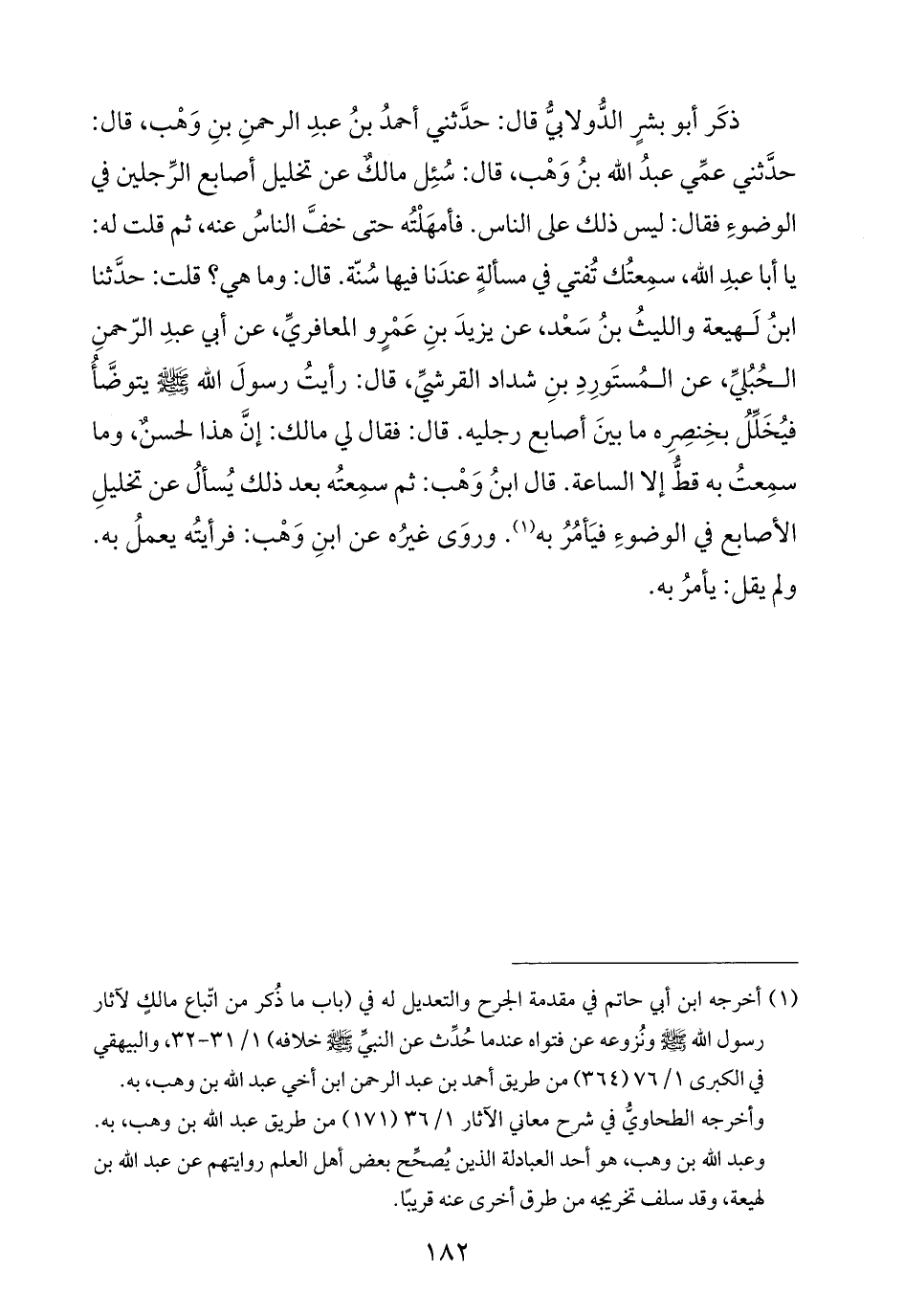 ذكَر أبو بشرٍ الدُّولابيُّ قال: حدَّثني أحمدُ بنُ عبدِ الرحمنِ بنِ وَهْب، قال: حدَّثني عمِّي عبدُ الله بنُ وَهْب، قال: سُئِل مالكٌ عن تخليل أصابع الرِّجلين في الوضوءِ فقال: ليس ذلك على الناس. فأمهَلْتُه حتى خفَّ الناسُ عنه، ثم قلت له: يا أبا عبدِ الله، سمِعتُك تُفتي في مسألةٍ عندَنا فيها سُنّة. قال: وما هي؟ قلت: حدَّثنا ابنُ لَهيعة والليثُ بنُ سَعْد، عن يزيدَ بنِ عَمْرٍو المعافريِّ، عن أبي عبدِ الرّحمنِ الحُبُليِّ، عن المُستَورِدِ بنِ شداد القرشيِّ، قال: رأيتُ رسولَ الله -صلى الله عليه وسلم- يتوضَّأُ فيُخَلِّلُ بخِنصِرِه ما بينَ أصابع رجليه. قال: فقال لي مالك: إنَّ هذا لحسنٌ، وما سمِعتُ به قطُّ إلا الساعة. قال ابنُ وَهْب: ثم سمِعتُه بعد ذلك يُسألُ عن تخليلِ الأصابع في الوضوءِ فيَأمُرُ به (¬١). وروَى غيرُه عن ابنِ وَهْب: فرأيتُه يعملُ به. ولم يقل: يأمرُ به.