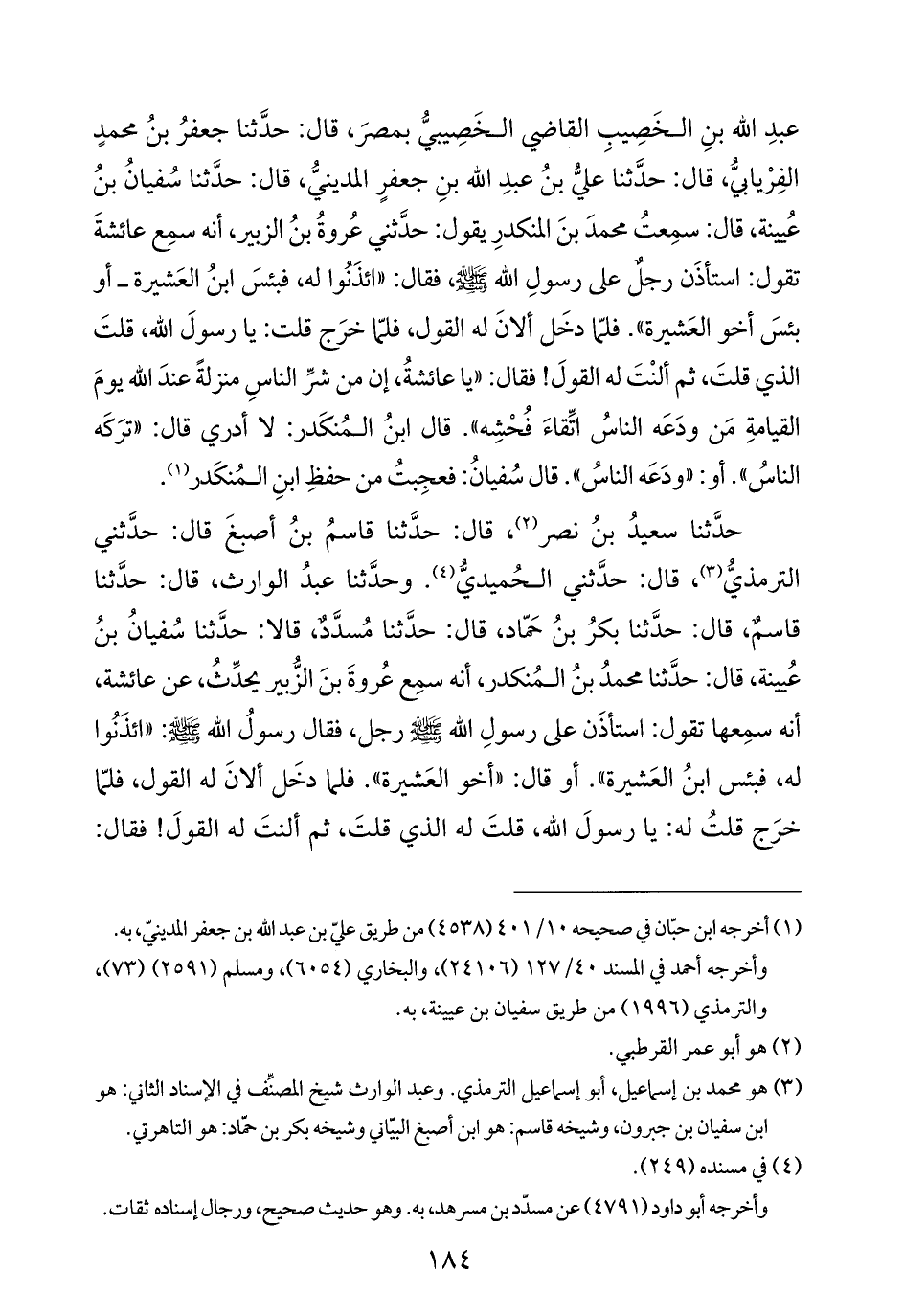 عبدِ الله بنِ الخَصِيبِ القاضي الخَصِيبيُّ بمصرَ، قال: حدَّثنا جعفرُ بنُ محمدٍ الفِرْيابيُّ، قال: حدَّثنا عليُّ بنُ عبدِ الله بنِ جعفرٍ المدينيُّ، قال: حدَّثنا سُفيانُ بنُ عُيينة، قال: سمِعتُ محمدَ بنَ المنكدرِ يقول: حدَّثني عُروةُ بنُ الزبير، أنه سمِع عائشةَ تقول: استأذَن رجلٌ على رسولِ الله -صلى الله عليه وسلم-، فقال: "ائذَنُوا له، فبئسَ ابنُ العَشيرة - و بئسَ أخو العَشيرة". فلمّا دخَل ألانَ له القول، فلمّا خرَج قلت: يا رسولَ الله، قلتَ الذي قلتَ، ثم ألنْتَ له القولَ! فقال: "يا عائشةُ، إن من شرِّ الناسِ منزلةً عندَ الله يومَ القيامةِ مَن ودَعَه الناسُ اتِّقاءَ فُحْشِه". قال ابنُ المُنكَدر: لا أدري قال: "ترَكَه الناسُ". أو: "ودَعَه الناسُ". قال سُفيانُ: فعجِبتُ من حفظِ ابنِ المُنكَدر (¬١).