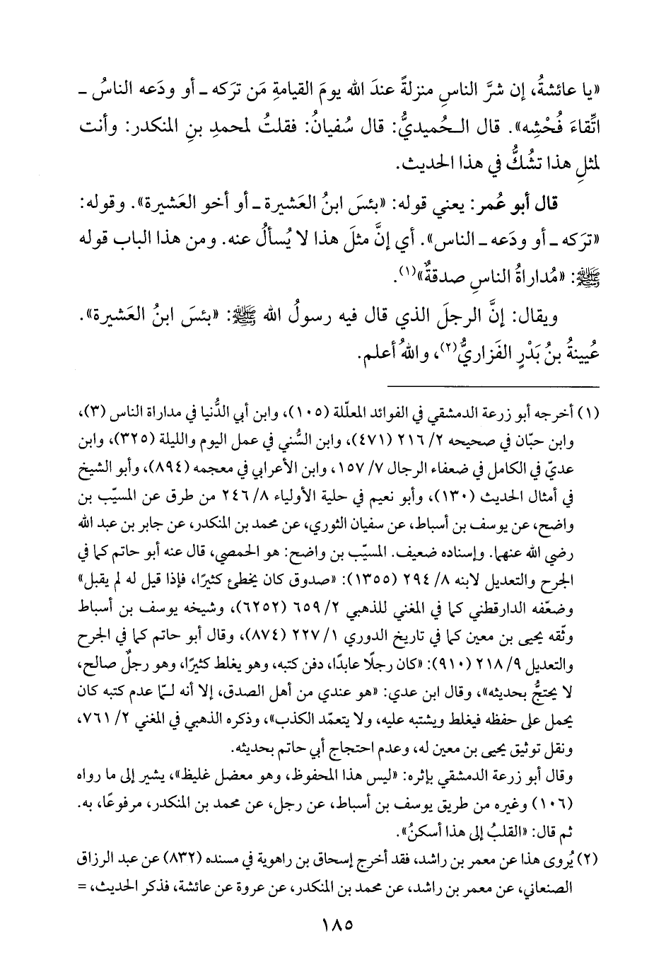 "يا عائشةُ، إن شرَّ الناسِ منزلةً عندَ الله يومَ القيامةِ مَن ترَكه -أو ودَعه الناسُ- اتِّقاءَ فُحْشِه". قال الحُميديُّ: قال سُفيانُ: فقلتُ لمحمدِ بنِ المنكدر: وأنت لمثلِ هذا تشُكُّ في هذا الحديث.