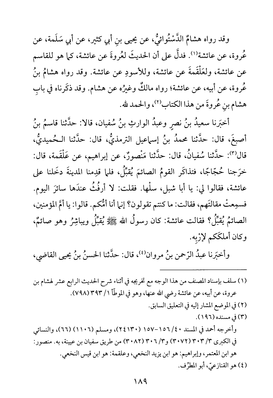 أخبَرنا سعيدُ بنُ نصرٍ وعبدُ الوارثِ بنُ سُفيان، قالا: حدَّثنا قاسمُ بنُ أصبغَ، قال: حدَّثنا محمدُ بنُ إسماعيل الترمذيُّ، قال: حدَّثنا الحُميديُّ، قال (¬٣): حدَّثنا سُفيانُ، قال: حدَّثنا مَنْصورٌ، عن إبراهيم، عن عَلْقَمة، قال: خرَجنا حُجّاجًا، فتذاكَر القومُ الصائمَ يُقبِّلُ، فلما قدِمنا المدينةَ دخَلنا على عائشة، فقالوا لي: يا أبا شبل، سلْها. فقلت: لا أرفُثُ عندَها سائرَ اليوم. فسمِعتْ مقالتَهم، فقالت: ما كنتم تقولون؟ إنما أنا أمُّكم. قالوا: يا أمَّ المؤمنين، الصائمُ يُقبِّلُ؟ فقالت عائشة: كان رسولُ الله -صلى الله عليه وسلم- يُقبِّلُ ويباشِرُ وهو صائمٌ، وكان أملكَكم لإرْبِه.