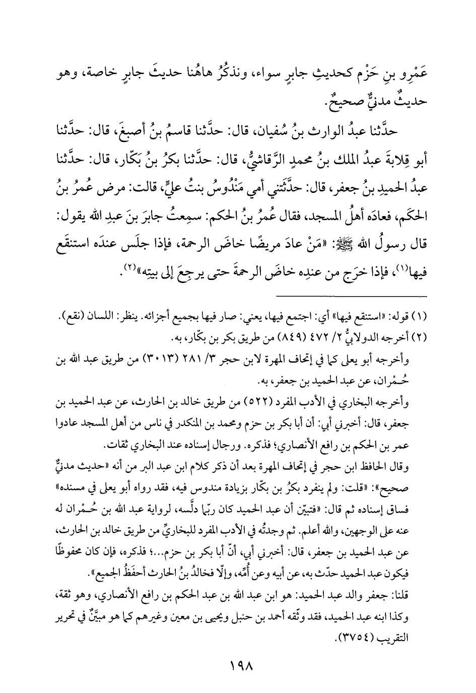 حدَّثنا عبدُ الوارث بنُ سُفيان، قال: حدَّثنا قاسمُ بنُ أصبغَ، قال: حدَّثنا أبو قِلابةَ عبدُ الملك بنُ محمدٍ الرَّقاشيُّ، قال: حدَّثنا بكرُ بنُ بَكّار، قال: حدَّثنا عبدُ الحميدِ بنُ جعفر، قال: حدَّثَتني أمي مَنْدُوسُ بنتُ عليٍّ، قالت: مرض عُمرُ بنُ الحكَم، فعادَه أهلُ المسجد، فقال عُمرُ بنُ الحكم: سمِعتُ جابرَ بنَ عبدِ الله يقول: قال رسولُ الله -صلى الله عليه وسلم-: "مَنْ عادَ مريضًا خاضَ الرحمة، فإذا جلَس عندَه استنقَع فيها (¬١)، فإذا خرَج من عندِه خاضَ الرحمةَ حتى يرجِعَ إلى بيتِه" (¬٢).