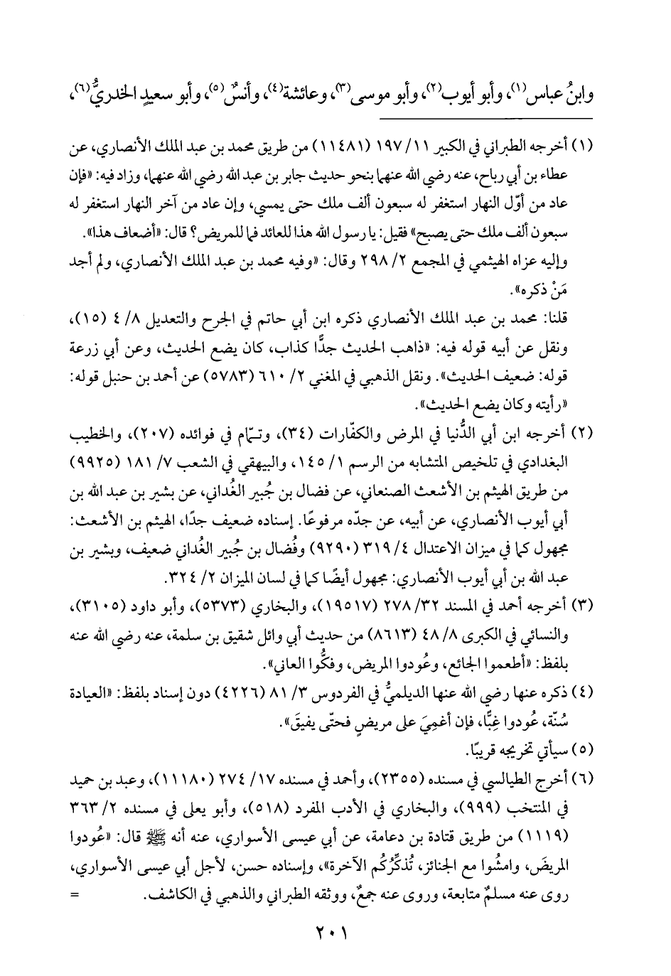 (¬١) أخرجه الطبراني في الكبير ١١/ ١٩٧ (١١٤٨١) من طريق محمد بن عبد الملك الأنصاري، عن عطاء بن أبي رباح، عنه رضي الله عنهما بنحو حديث جابر بن عبد الله رضي الله عنهما، وزاد فيه: "فإن عاد من أوّل النهار استغفر له سبعون ألف ملك حتى يمسي، وإن عاد من آخر النهار استغفر له سبعون ألف ملك حتى يصبح" فقيل: يا رسول الله هذا للعائد فما للمريض؟ قال: "أضعاف هذا".