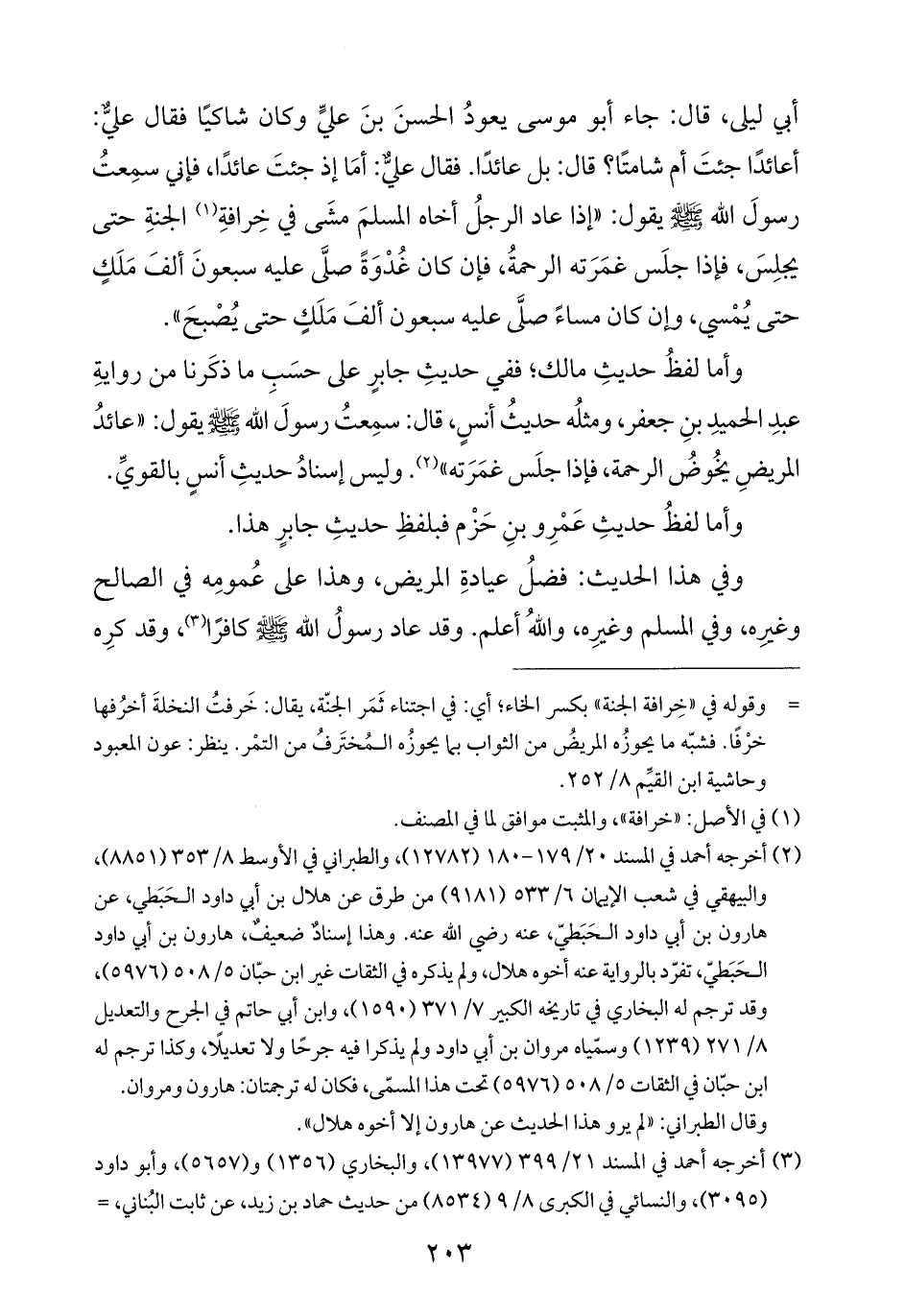 أبي ليلى، قال: جاء أبو موسى يعودُ الحسنَ بنَ عليٍّ وكان شاكيًا فقال عليٌّ: أعائدًا جئتَ أم شامتًا؟ قال: بل عائدًا. فقال عليٌّ: أمَا إذ جئتَ عائدًا، فإني سِمعتُ رسولَ الله -صلى الله عليه وسلم- يقول: "إذا عاد الرجلُ أخاه المسلمَ مشَى في خِرافةِ (¬١) الجنةِ حتى يجلِسَ، فإذا جلَس غمَرَته الرحمةُ، فإن كان غُدْوَةً صلَّى عليه سبعونَ ألفَ مَلَكٍ حتى يُمْسي، وإن كان مساءً صلَّى عليه سبعون ألفَ مَلَكٍ حتى يُصْبحَ".