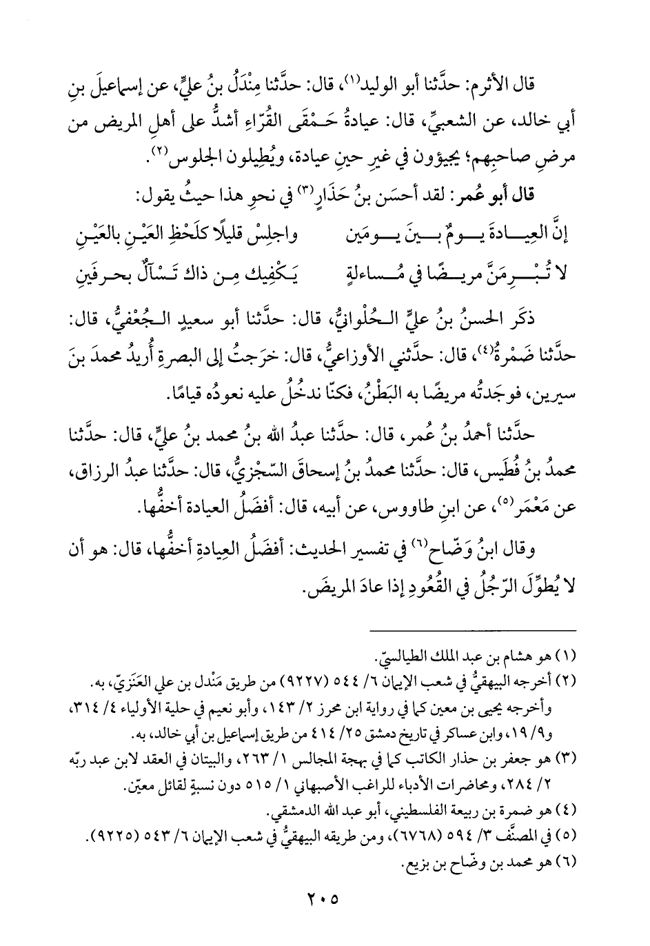 قال الأثرم: حدَّثنا أبو الوليد (¬١)، قال: حدَّثنا مِنْدَلُ بنُ عليٍّ، عن إسماعيلَ بنِ أبي خالد، عن الشعبيِّ، قال: عيادةُ حَمْقَى القُرّاءِ أشدُّ على أهلِ المريض من مرضِ صاحبِهم؛ يجيؤون في غيرِ حينِ عيادة، ويُطِيلون الجلوس (¬٢).
