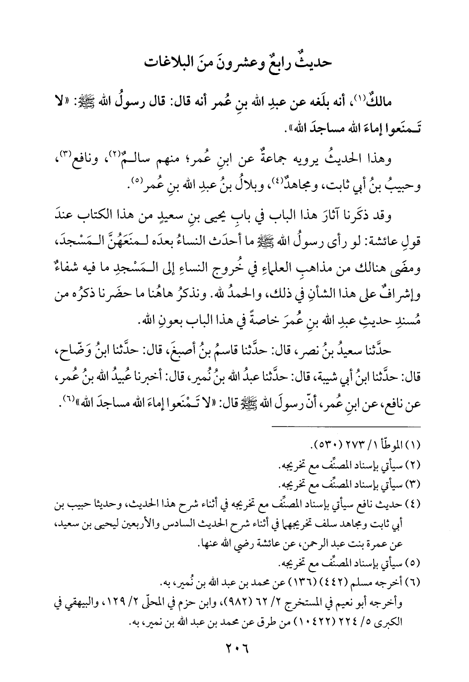 حدَّثنا سعيدُ بنُ نصر، قال: حدَّثنا قاسمُ بنُ أصبغَ، قال: حدَّثنا ابنُ وَضّاح، قال: حدَّثنا ابنُ أبي شيبة، قال: حدَّثنا عبدُ الله بنُ نُمير، قال: أخبرنا عُبيدُ الله بنُ عُمر، عن نافع، عن ابنِ عُمر، أنّ رسولَ الله -صلى الله عليه وسلم- قال: "لا تَمْنَعوا إماءَ الله مساجدَ الله" (¬٦).