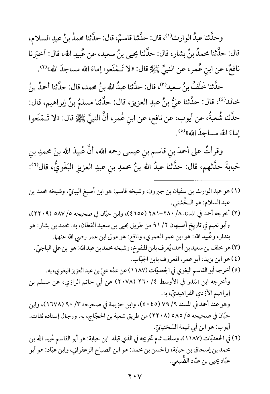 حدَّثنا خَلَفُ بنُ سعيد (¬٣)، قال: حدَّثنا عبدُ الله بنُ محمد، قال: حدَّثنا أحمدُ بنُ خالد (¬٤)، قال: حدَّثنا عليُّ بنُ عبدِ العزيز، قال: حدَّثنا مسلمُ بنُ إبراهيم، قال: حدَّثنا شُعبةُ، عن أيوب، عن نافع، عن ابنِ عُمر، أنَّ النبيَّ -صلى الله عليه وسلم- قال: "لا تَمْنَعوا إماءَ الله مساجدَ الله" (¬٥).