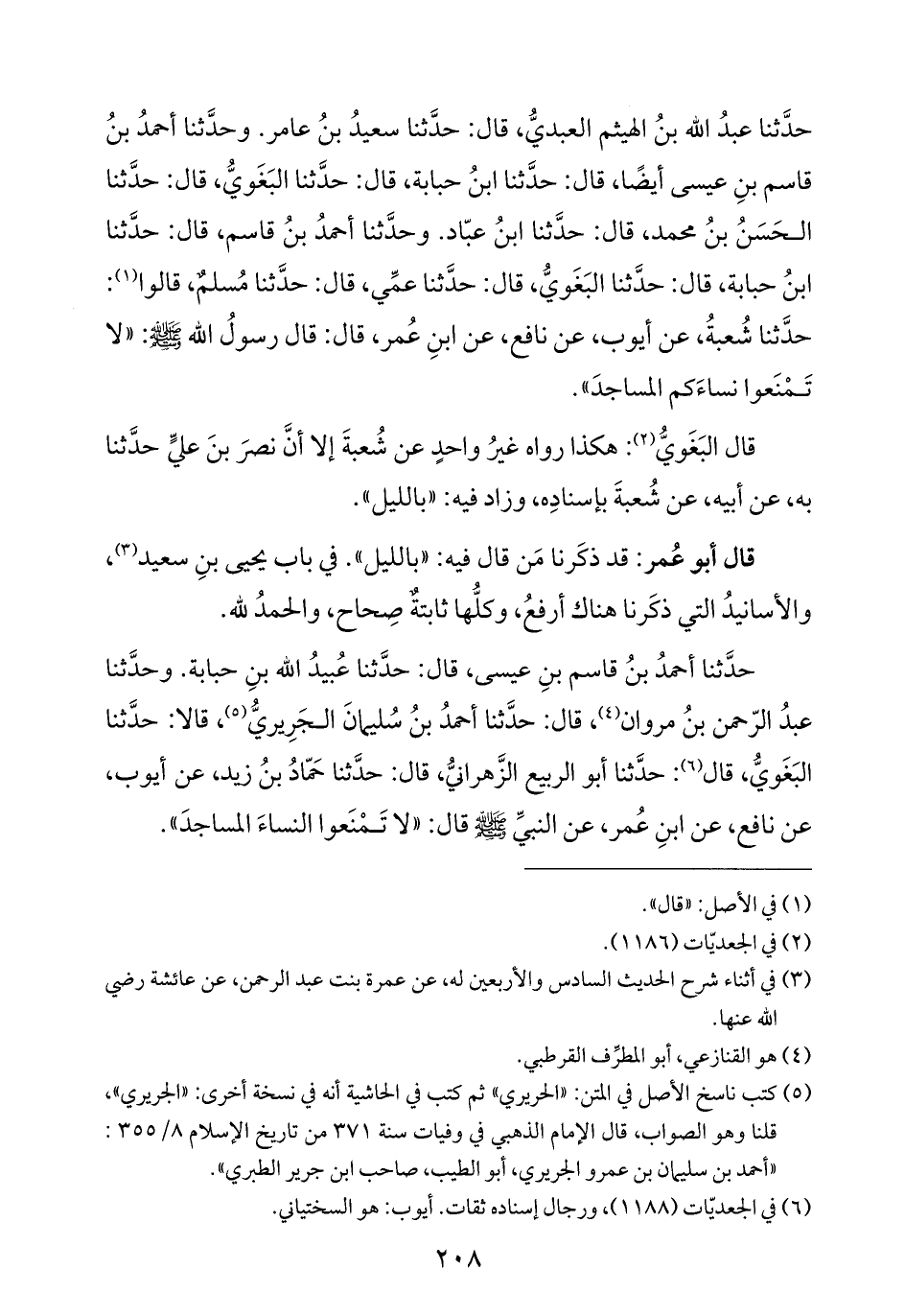 حدَّثنا أحمدُ بنُ قاسم بنِ عيسى، قال: حدَّثنا عُبيدُ الله بنِ حبابة. وحدَّثنا عبدُ الرّحمن بنُ مروان (¬٤)، قال: حدَّثنا أحمدُ بنُ سُليمانَ الجَرِيريُّ (¬٥)، قالا: حدَّثنا البَغَويُّ، قال (¬٦): حدَّثنا أبو الربيع الزَّهرانيُّ، قال: حدَّثنا حَمّادُ بنُ زيد، عن أيوب، عن نافع، عن ابنِ عُمر، عن النبيِّ -صلى الله عليه وسلم- قال: "لا تَمْنَعوا النساءَ المساجدَ".