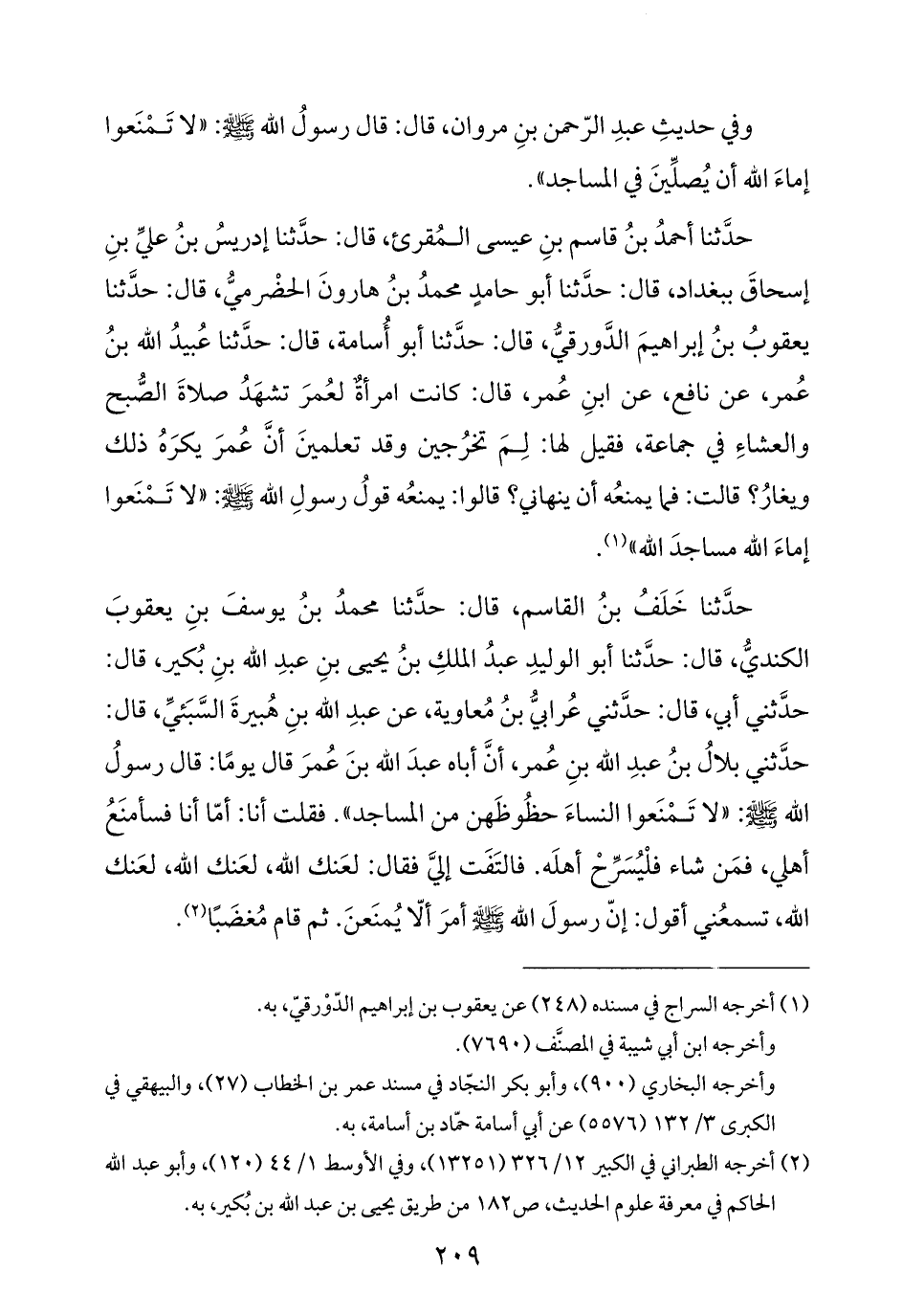 حدَّثنا أحمدُ بنُ قاسم بنِ عيسى المُقرئ، قال: حدَّثنا إدريسُ بنُ عليِّ بنِ إسحاقَ ببغداد، قال: حدَّثنا أبو حامدٍ محمدُ بنُ هارونَ الحضْرميُّ، قال: حدَّثنا يعقوبُ بنُ إبراهيمَ الدَّورقيُّ، قال: حدَّثنا أبو أُسامة، قال: حدَّثنا عُبيدُ الله بنُ عُمر، عن نافع، عن ابنِ عُمر، قال: كانت امرأةٌ لعُمرَ تشهَدُ صلاةَ الصُّبح والعشاءِ في جماعة، فقيل لها: لِمَ تخرُجين وقد تعلمينَ أنَّ عُمرَ يكرَهُ ذلك ويغارُ؟ قالت: فما يمنعُه أن ينهاني؟ قالوا: يمنعُه قولُ رسولِ الله -صلى الله عليه وسلم-: "لا تَمْنَعوا إماءَ الله مساجدَ الله" (¬١).