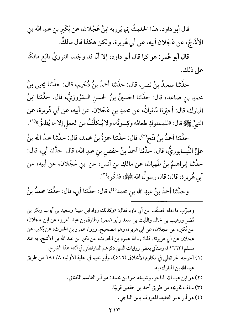 حدَّثنا سعيدُ بنُ نصر، قال: حدَّثنا أحمدُ بنُ دُحَيم، قال: حدَّثنا يحيى بنُ محمدِ بنِ صاعد، قال: حدَّثنا الحسينُ بنُ الحسنِ المَرْوزيُّ، قال: حدَّثنا ابنُ المبارك، قال: أخبَرنا سفيانُ، عن محمدِ بنِ عَجْلان، عن أبيه، عن أبي هُريرة، عن النبيِّ -صلى الله عليه وسلم- قال: "للمملوكِ طعامُه وكِسوتُه، ولا يُكلَّفُ من العملِ إلا ما يُطيقُ" (¬١).