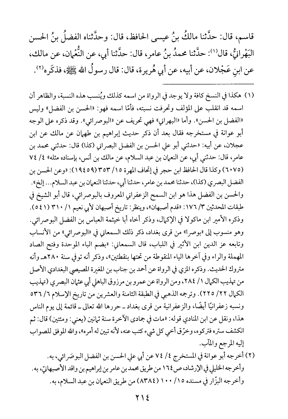 (¬١) هكذا في النسخ كافة ولا يوجد في الرواة من اسمه كذلك ويُنسب هذه النسبة، والظاهر أن اسمه قد انقلب على المؤلف وتحرفت نسبته، فأمّا اسمه فهو: "الحسن بن الفضل" وليس "الفضل بن الحسن". وأما "البهراني" فهي تحريف عن "البوصرائي". وقد ذكره على الوجه أبو عوانة في مستخرجه فقال بعد أن ذكر حديث إبراهيم بن طهمان عن مالك عن ابن عجلان، عن أبيه: "حدثني أبو علي الحسن بن الفضل البصراني (كذا) قال: حدثني محمد بن عامر، قال: حدثني أبي، عن النعمان بن عبد السلام، عن مالك بن أنس، بإسناده مثله" ٤/ ٧٤ (٦٠٧٥) وكذا قال الحافظ ابن حجر في إتحاف المهرة ١٥/ ٣٥٣ (١٩٤٥٩): "وعن الحسن بن الفضل البصري (كذا)، حدثنا محمد بن عامر، حدثنا أبي، حدثنا النعمان بن عبد السلام ... إلخ". والحسن بن الفضل هذا هو ابن السمح الزعفراني المعروف بالبوصرائي، قال أبو الشيخ في طبقات المحدثين ٣/ ١٧٦: "قدم أصبهان"، وينظر: تاريخ أصبهان لأبي نعيم ١/ ٣١٠ (٥٤١). وذكره الأمير ابن ماكولا في الإكمال، وذكر أخاه أبا خيثمة العباس بن الفضل البوصرائي. وهو منسوب إلى "بوصرا" من قرى بغداد، ذكر ذلك السمعاني في "البوصرائي" من الأنساب وتابعه عز الدين ابن الأثير في اللباب، قال السمعاني: "بضم الباء الموحدة وفتح الصاد المهملة والراء وفي آخرها الياء المنقوطة من تحتها بنقطتين"، وذكر أنه توفي سنة ٢٨٠ هـ وأنه متروك الحديث. وذكره المزي في الرواة عن أحمد بن جناب بن المغيرة المصيمي البغدادي الأصل من تهذيب الكمال ١/ ٢٨٤، ومن الرواة عن عمرو بن مرزوق الباهلي أبي عثمان البصري (تهذيب الكمال ٢٢/ ٢٢٥). وترجمه الذهبي في الطبقة الثامنة والعشرين من تاريخ الإسلام ٦/ ٥٣٦ ونسبه زعفرانيًا أيضًا، والزعفرانية من قرى بغداد -حررها الله تعالى- قائمة إلى يوم الناس هذا، ونقل عن ابن المنادي قوله: "مات في جمادى الآخرة سنة ثمانين (يعني: ومئتين) قال: ثم انكشف ستره فتركوه، وخرّق أخي كل شيء كتب عنه، لأنه تبين له أمره"، والله الموفق للصواب إليه المرجع والمآب.