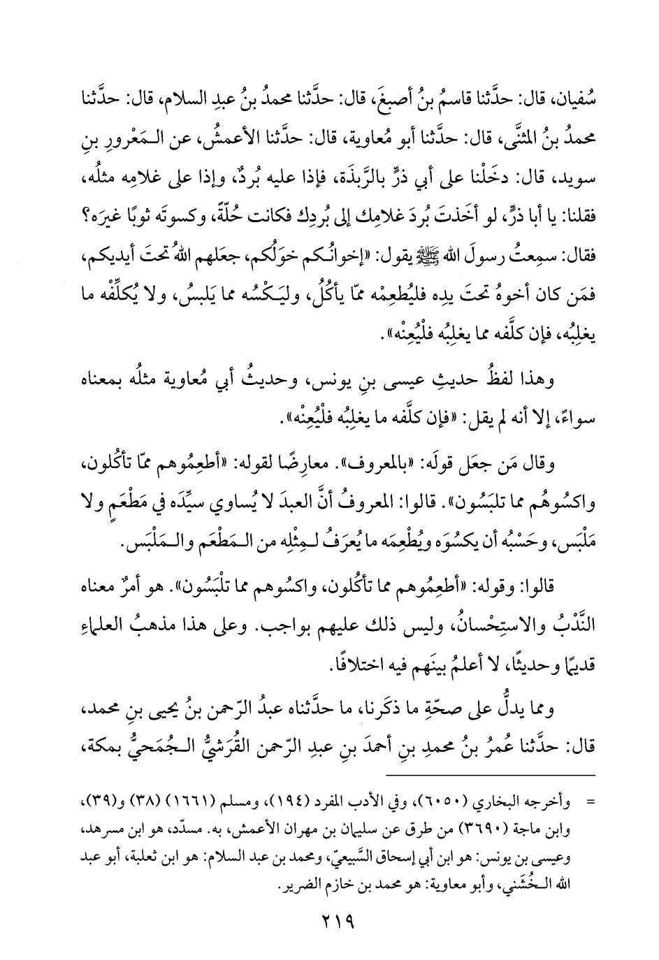 سُفيان، قال: حدَّثنا قاسمُ بنُ أصبغَ، قال: حدَّثنا محمدُ بنُ عبدِ السلام، قال: حدَّثنا محمدُ بنُ المثنَّى، قال: حدَّثنا أبو مُعاوية، قال: حدَّثنا الأعمشُ، عن المَعْرورِ بنِ سويد، قال: دخَلْنا على أبي ذرٍّ بالرَّبذَة، فإذا عليه بُردٌ، وإذا على غلامِه مثلُه، فقلنا: يا أبا ذرٍّ، لو أخَذتَ بُردَ غلامِك إلى بُردِك فكانت حُلّةً، وكسوتَه ثوبًا غيرَه؟ فقال: سمِعتُ رسولَ الله -صلى الله عليه وسلم- يقول: "إخوانُكم خوَلُكم، جعَلهم اللهُ تحتَ أيديكم، فمَن كان أخوهُ تحتَ يدِه فليُطعِمْه ممّا يأكُلُ، وليَكْسُه مما يَلبسُ، ولا يُكلِّفْه ما يغلِبُه، فإن كلَّفه مما يغلِبُه فلْيُعِنْه".