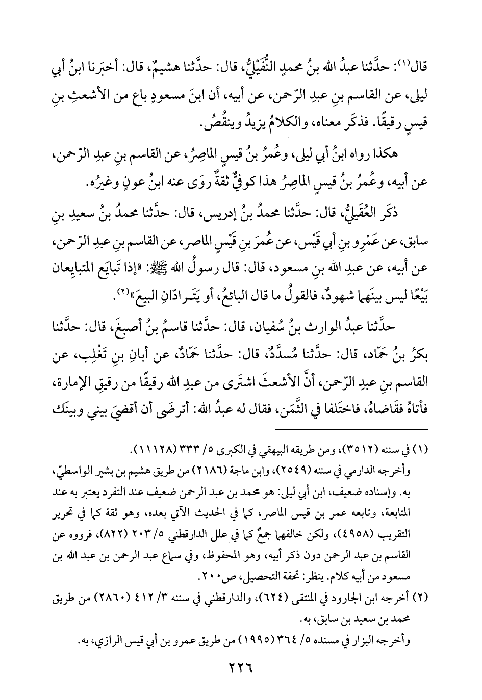 قال (¬١): حدَّثنا عبدُ الله بنُ محمدٍ النُّفَيْليُّ، قال: حدَّثنا هشيمٌ، قال: أخبَرنا ابنُ أبي ليلى، عن القاسم بنِ عبدِ الرّحمن، عن أبيه، أن ابنَ مسعودٍ باع من الأشعثِ بنِ قيسٍ رقيقًا. فذكَر معناه، والكلامُ يزيدُ وينقُصُ.