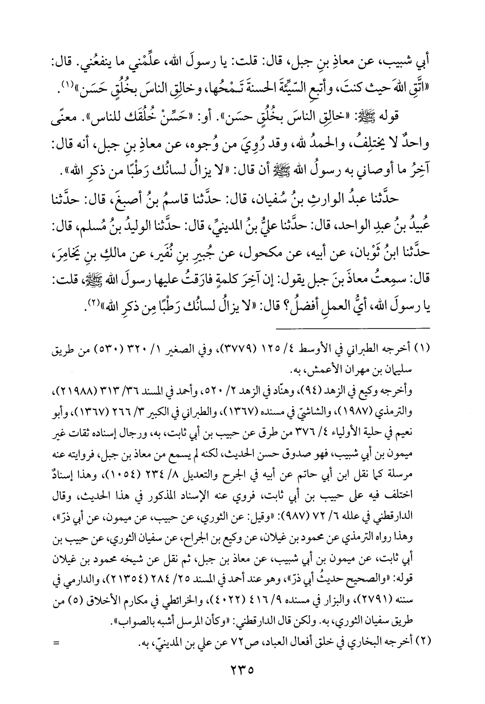 حدَّثنا عبدُ الوارثِ بنُ سُفيان، قال: حدَّثنا قاسمُ بنُ أصبغَ، قال: حدَّثنا عُبيدُ بنُ عبدِ الواحد، قال: حدَّثنا عليُّ بنُ المدينيِّ، قال: حدَّثنا الوليدُ بنُ مُسلم، قال: حدَّثنا ابنُ ثَوْبان، عن أبيه، عن مكحول، عن جُبيرِ بنِ نُفَير، عن مالكِ بنِ يَخامِرَ، قال: سمِعتُ معاذَ بنَ جبل يقول: إن آخِرَ كلمةٍ فارَقتُ عليها رسولَ الله -صلى الله عليه وسلم-، قلت: يا رسولَ الله، أيُّ العملِ أفضلُ؟ قال: "لا يزالُ لسانُك رَطْبًا مِن ذكرِ الله" (¬٢).