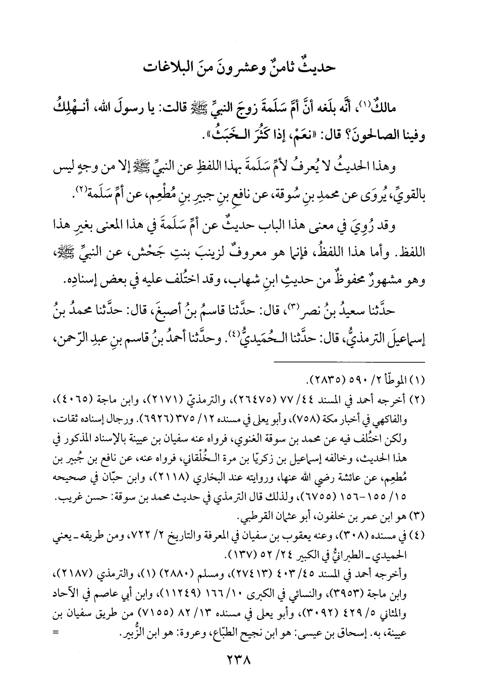 مالكٌ (¬١)، أنَّه بلَغه أنَّ أمَّ سَلَمةَ زوجَ النبيِّ -صلى الله عليه وسلم- قالت: يا رسولَ الله، أنهْلِكُ وفينا الصالحونَ؟ قال: "نعَمْ، إذا كَثُرَ الخَبَثُ".