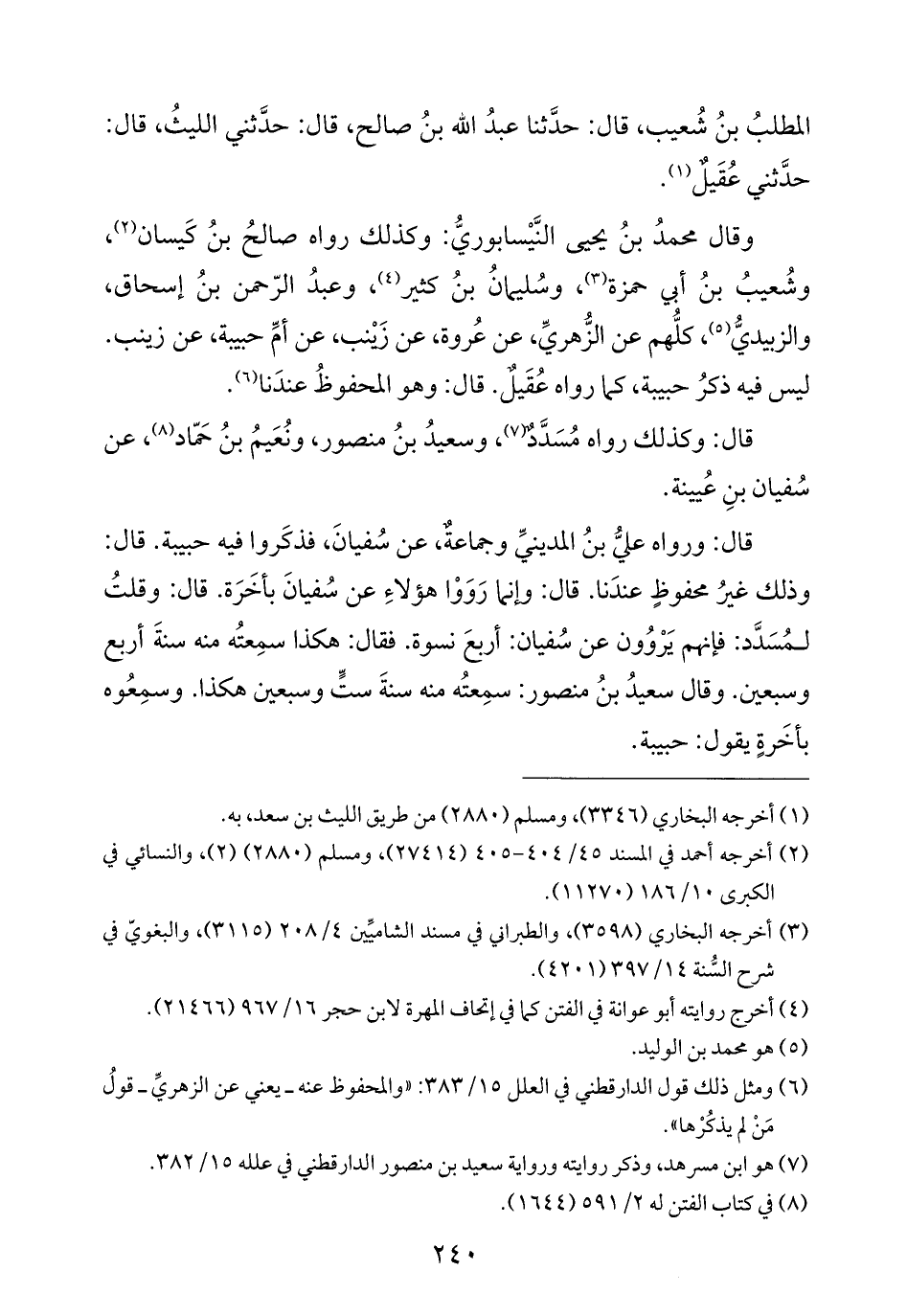 قال: ورواه عليُّ بنُ المدينيِّ وجماعةٌ، عن سُفيانَ، فذكَروا فيه حبيبة. قال: وذلك غيرُ محفوظٍ عندَنا. قال: وإنما رَوَوْا هؤلاءِ عن سُفيانَ بأخَرَة. قال: وقلتُ لمُسَدَّد: فإنهم يَرْوُون عن سُفيان: أربعَ نسوة. فقال: هكذا سمِعتُه منه سنةَ أربع وسبعين. وقال سعيدُ بنُ منصور: سمِعتُه منه سنةَ ستٍّ وسبعين هكذا. وسمِعُوه بأخَرةٍ يقول: حبيبة.