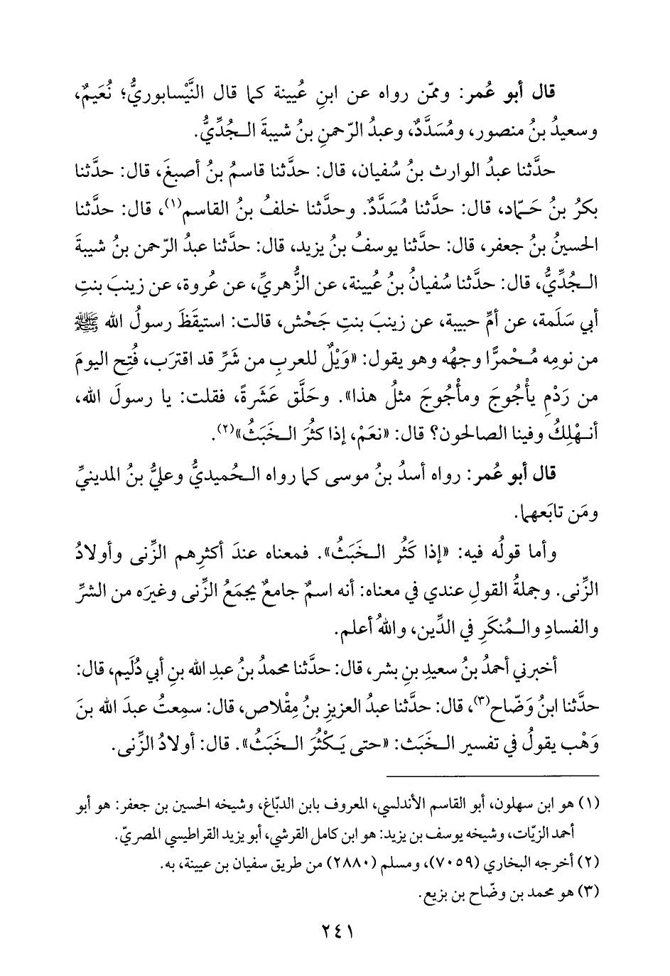 حدَّثنا عبدُ الوارث بنُ سُفيان، قال: حدَّثنا قاسمُ بنُ أصبغَ، قال: حدَّثنا بكرُ بنُ حَمّاد، قال: حدَّثنا مُسَدَّدٌ. وحدَّثنا خلفُ بنُ القاسم (¬١)، قال: حدَّثنا الحسينُ بنُ جعفر، قال: حدَّثنا يوسفُ بنُ يزيد، قال: حدَّثنا عبدُ الرّحمن بنُ شيبةَ الجُدِّيُّ، قال: حدَّثنا سُفيانُ بنُ عُيينة، عن الزُّهريِّ، عن عُروة، عن زينبَ بنتِ أبي سَلَمة، عن أمِّ حبيبة، عن زينبَ بنتِ جَحْش، قالت: استيقَظَ رسولُ الله -صلى الله عليه وسلم- من نومِه مُحْمرًّا وجهُه وهو يقول: "وَيْلٌ للعربِ من شَرِّ قد اقترَب، فُتِح اليومَ من رَدْمِ يأْجُوجَ ومأْجُوجَ مثلُ هذا". وحَلَّق عَشَرةً، فقلت: يا رسولَ الله، أنهْلِكُ وفينا الصالحون؟ قال: "نعَمْ، إذا كثُرَ الخَبَثُ" (¬٢).