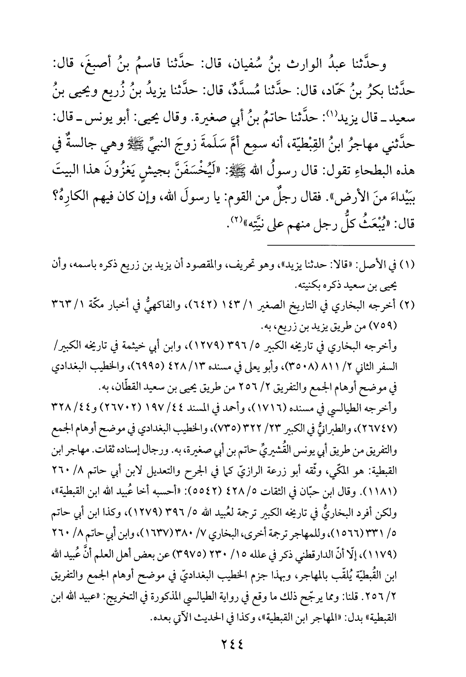 وحدَّثنا عبدُ الوارث بنُ سُفيان، قال: حدَّثنا قاسمُ بنُ أصبغَ، قال: حدَّثنا بكرُ بنُ حَمّاد، قال: حدَّثنا مُسدَّدٌ، قال: حدَّثنا يزيدُ بنُ زُريع ويحيى بنُ سعيد -قال يزيد (¬١): حدَّثنا حاتمُ بنُ أبي صغيرة. وقال يحيى: أبو يونس- قال: حدَّثني مهاجرُ ابنُ القِبْطيّة، أنه سمِع أمَّ سَلَمةَ زوجَ النبيِّ -صلى الله عليه وسلم- وهي جالسةٌ في هذه البطحاءِ تقول: قال رسولُ الله -صلى الله عليه وسلم-: "لَيُخْسَفَنَّ بجيشٍ يَغزُونَ هذا البيتَ ببَيْداءَ منَ الأرض". فقال رجلٌ من القوم: يا رسولَ الله، وإن كان فيهم الكارِهُ؟ قال: "يُبْعَثُ كلُّ رجل منهم على نيَّتِه" (¬٢).