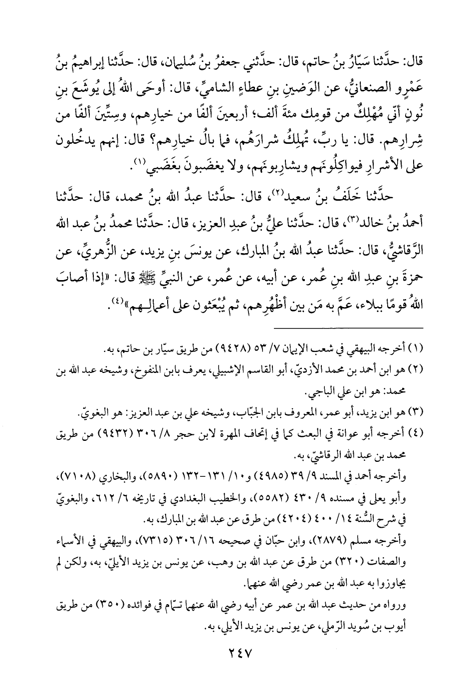 حدَّثنا خَلَفُ بنُ سعيد (¬٢)، قال: حدَّثنا عبدُ الله بنُ محمد، قال: حدَّثنا أحمدُ بنُ خالد (¬٣)، قال: حدَّثنا عليُّ بنُ عبدِ العزيز، قال: حدَّثنا محمدُ بنُ عبد الله الرَّقاشيُّ، قال: حدَّثنا عبدُ الله بنُ المبارك، عن يونسَ بنِ يزيد، عن الزُّهريِّ، عن حمزةَ بنِ عبدِ الله بنِ عُمر، عن أبيه، عن عُمر، عن النبيِّ -صلى الله عليه وسلم- قال: "إذا أصابَ اللهُ قومًا ببلاء، عَمَّ به مَن بين أظْهُرِهم، ثم يُبْعَثون على أعمالِهم" (¬٤).