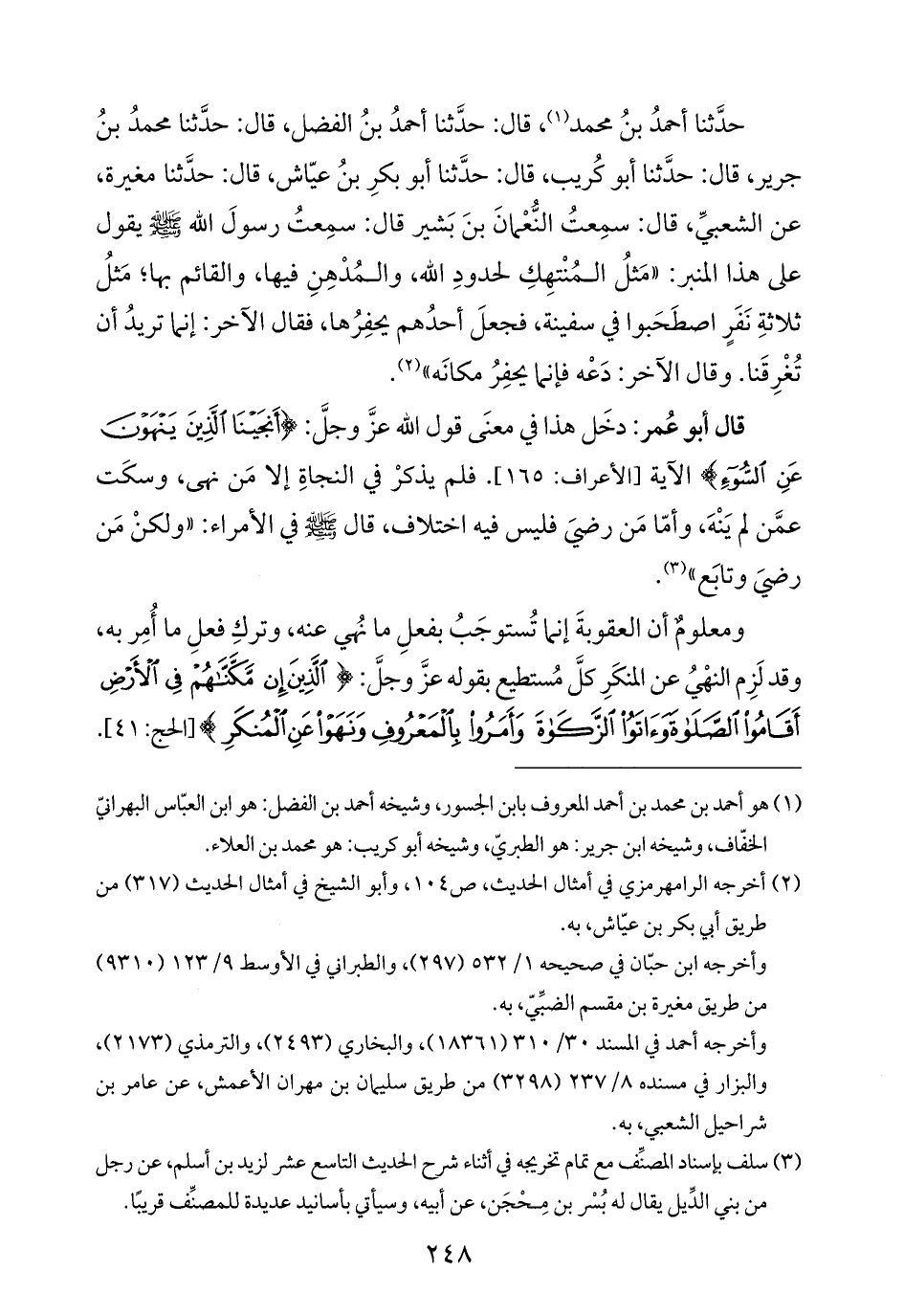 حدَّثنا أحمدُ بنُ محمد (¬١)، قال: حدَّثنا أحمدُ بنُ الفضل، قال: حدَّثنا محمدُ بنُ جرير، قال: حدَّثنا أبو كُريب، قال: حدَّثنا أبو بكرِ بنُ عيّاش، قال: حدَّثنا مغيرة، عن الشعبيِّ، قال: سمِعتُ النُّعْمانَ بنَ بَشير قال: سمِعتُ رسولَ الله -صلى الله عليه وسلم- يقول على هذا المنبر: "مَثلُ المُنْتهِكِ لحدودِ الله، والمُدْهِنِ فيها، والقائم بها؛ مَثلُ ثلاثةِ نَفَرٍ اصطَحَبوا في سفينة، فجعلَ أحدُهم يحفِرُها، فقال الآخر: إنما تريدُ أن تُغْرِقَنا. وقال الآخر: دَعْه فإنما يحفِرُ مكانَه" (¬٢).