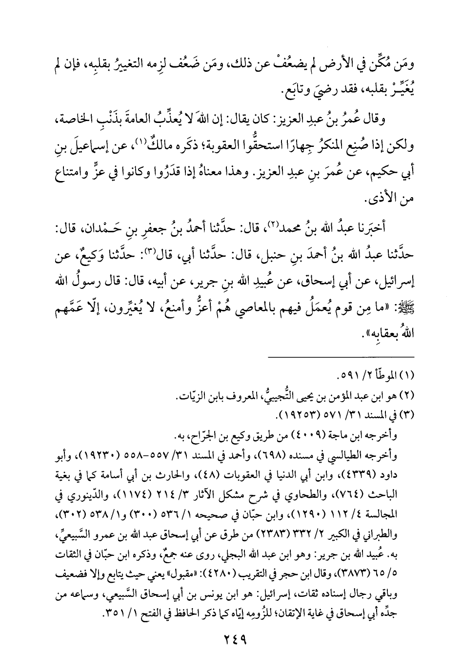 أخبَرنا عبدُ الله بنُ محمد (¬٢)، قال: حدَّثنا أحمدُ بنُ جعفرِ بنِ حَمْدان، قال: حدَّثنا عبدُ الله بنُ أحمدَ بنِ حنبل، قال: حدَّثنا أبي، قال (¬٣): حدَّثنا وَكيعٌ، عن إسرائيل، عن أبي إسحاق، عن عُبيدِ الله بنِ جرير، عن أبيه، قال: قال رسولُ الله -صلى الله عليه وسلم-: "ما مِن قوم يُعمَلُ فيهم بالمعاصي هُمْ أعزُّ وأمنعُ، لا يُغيِّرون، إلّا عَمَّهم اللهُ بعقابِه".