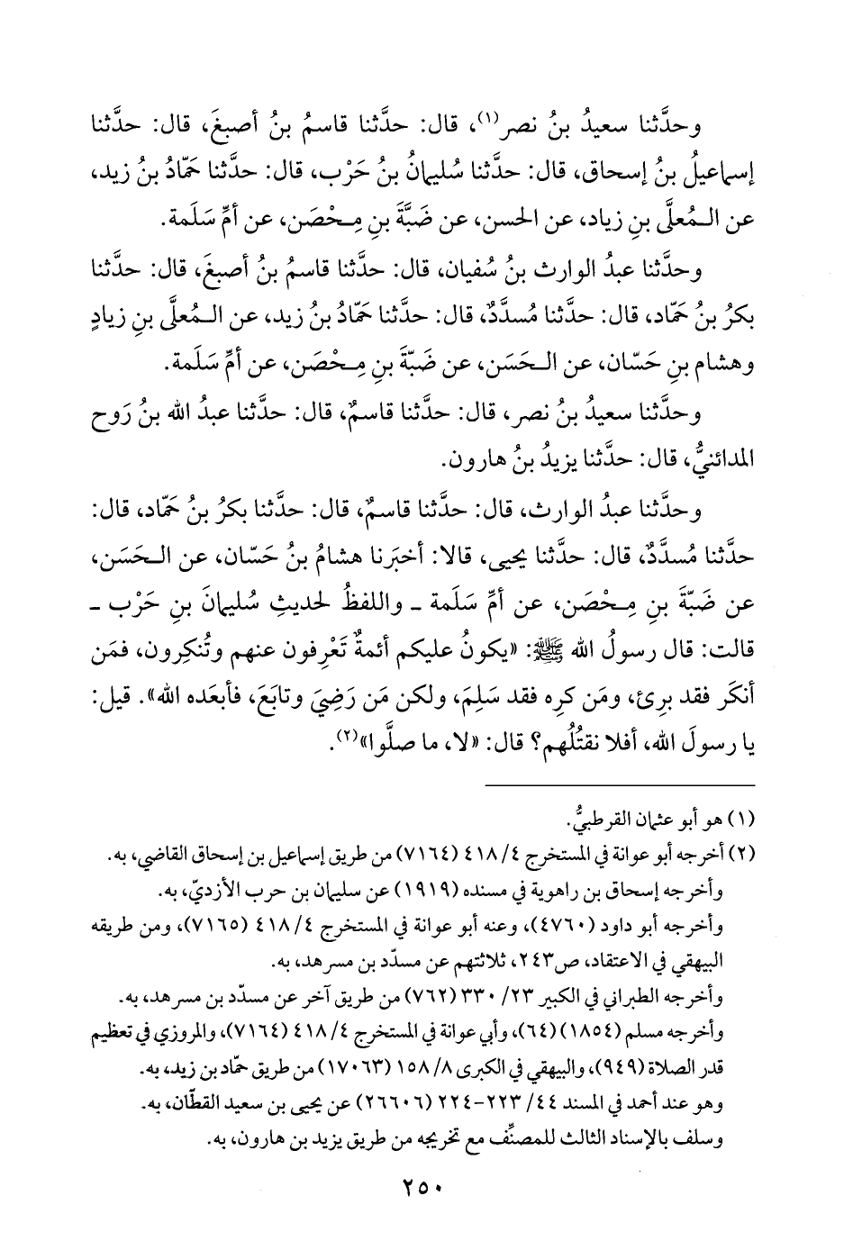 وحدَّثنا عبدُ الوارث، قال: حدَّثنا قاسمٌ، قال: حدَّثنا بكرُ بنُ حَمّاد، قال: حدَّثنا مُسدَّدٌ، قال: حدَّثنا يحيى، قالا: أخبَرنا هشامُ بنُ حَسّان، عن الحَسَن، عن ضَبّةَ بنِ مِحْصَن، عن أمِّ سَلَمة -واللفظُ لحديثِ سُليمانَ بنِ حَرْب- قالت: قال رسولُ الله -صلى الله عليه وسلم-: "يكونُ عليكم أئمةٌ تَعْرِفون عنهم وتُنكِرون، فمَن أنكَر فقد برِئ، ومَن كرِه فقد سَلِمَ، ولكن مَن رَضِيَ وتابَعَ، فأبعَده الله". قيل: يا رسولَ الله، أفلا نقتُلُهم؟ قال: "لا، ما صلَّوا" (¬٢).
