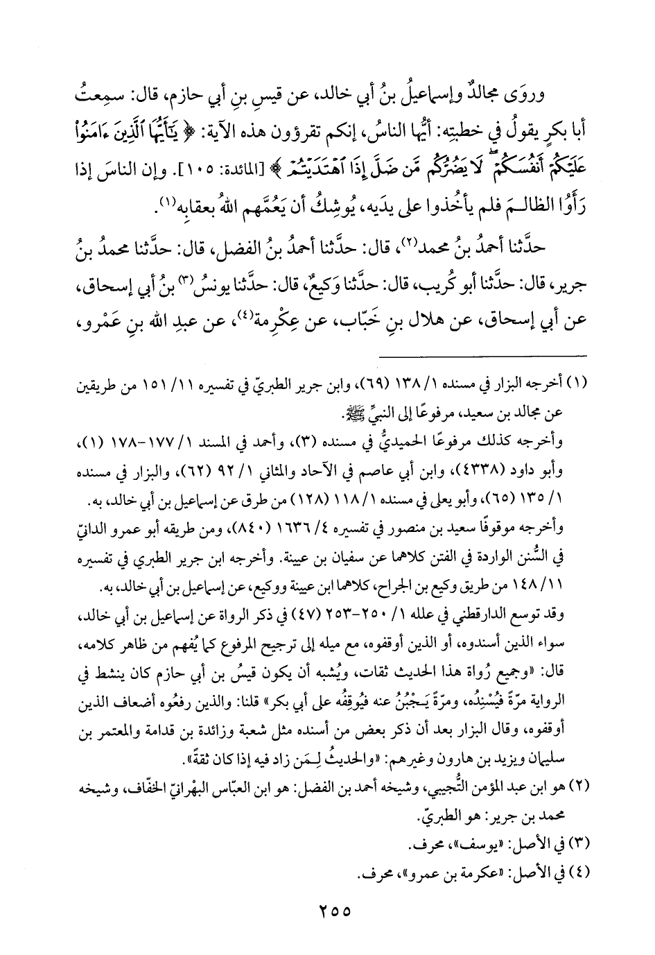 وروَى مجالدٌ وإسماعيلُ بنُ أبي خالد، عن قيسِ بنِ أبي حازم، قال: سمِعتُ أبا بكرٍ يقولُ في خطبتِه: أيُّها الناسُ، إنكم تقرؤون هذه الآية: {يَاأَيُّهَا الَّذِينَ آمَنُوا عَلَيْكُمْ أَنْفُسَكُمْ لَا يَضُرُّكُمْ مَنْ ضَلَّ إِذَا اهْتَدَيْتُمْ} [المائدة: ١٠٥]. وإن الناسَ إذا رَأَوُا الظالمَ فلم يأخُذوا على يدَيه، يُوشِكُ أن يَعُمَّهم اللهُ بعقابِه (¬١).