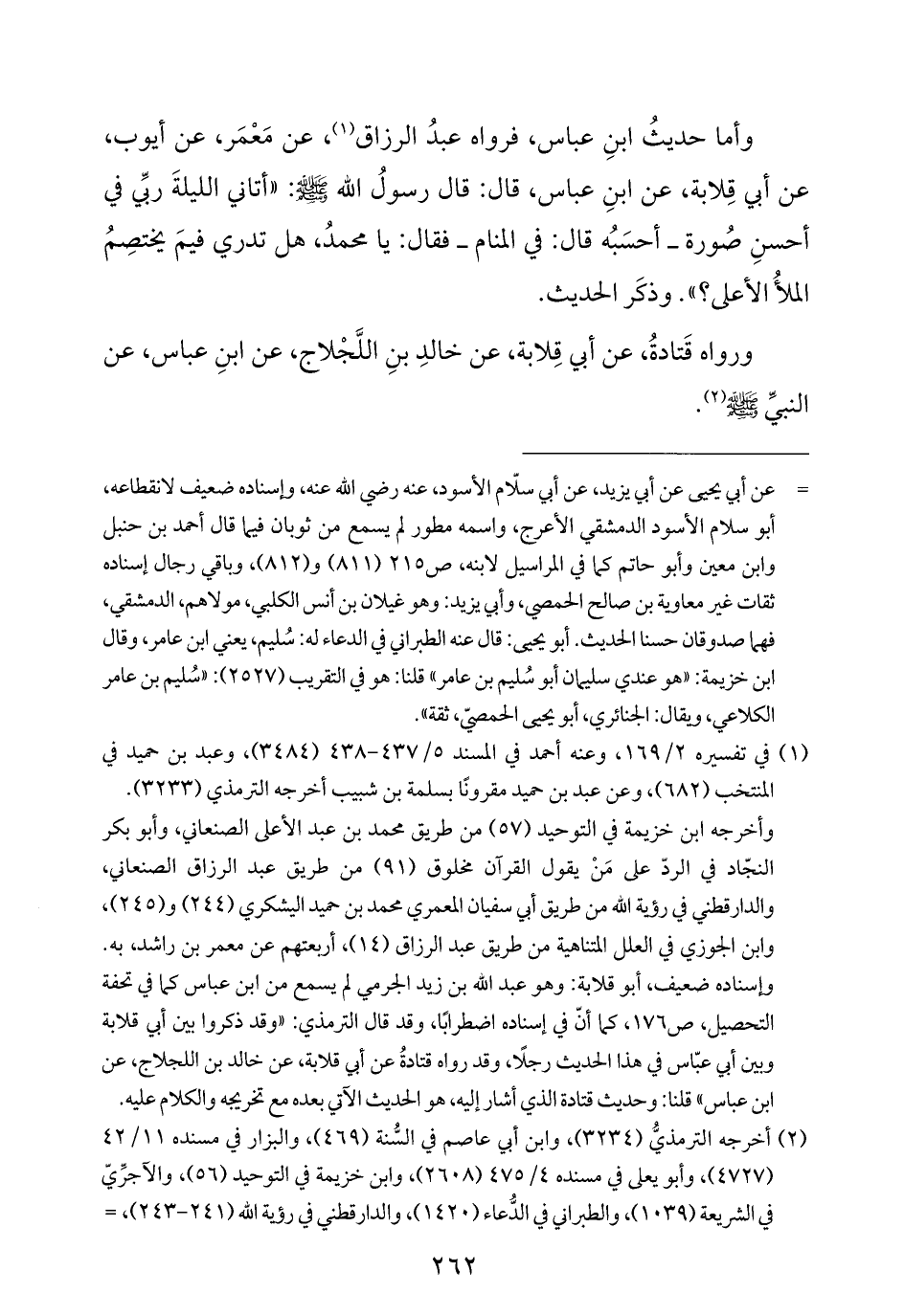 وأما حديثُ ابنِ عباس، فرواه عبدُ الرزاق (¬١)، عن مَعْمَر، عن أيوب، عن أبي قِلابة، عن ابنِ عباس، قال: قال رسولُ الله -صلى الله عليه وسلم-: "أتاني الليلةَ ربِّي في أحسنِ صُورة -أحسَبُه قال: في المنام- فقال: يا محمدُ، هل تدري فيمَ يختصِمُ الملأُ الأعلى؟ ". وذكَر الحديث.