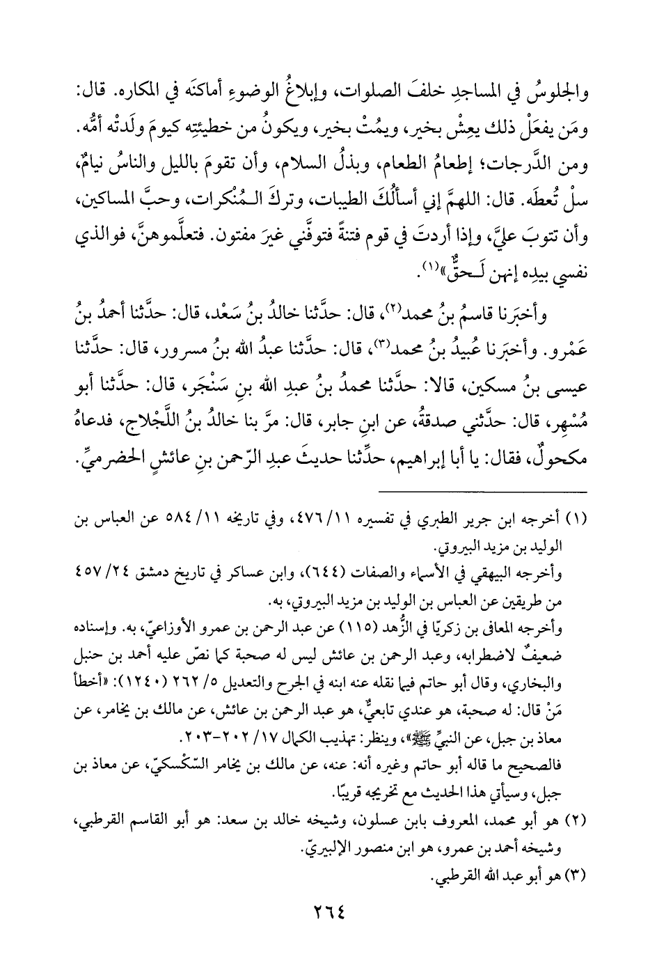 وأخبَرنا قاسمُ بنُ محمد (¬٢)، قال: حدَّثنا خالدُ بنُ سَعْد، قال: حدَّثنا أحمدُ بنُ عَمْرو. وأخبَرنا عُبيدُ بنُ محمد (¬٣)، قال: حدَّثنا عبدُ الله بنُ مسرور، قال: حدَّثنا عيسى بنُ مسكين، قالا: حدَّثنا محمدُ بنُ عبدِ الله بنِ سَنْجَر، قال: حدَّثنا أبو مُسْهِر، قال: حدَّثني صدقةُ، عن ابنِ جابر، قال: مرَّ بنا خالدُ بنُ اللَّجْلاج، فدعاهُ مكحولٌ، فقال: يا أبا إبراهيم، حدِّثنا حديثَ عبدِ الرّحمن بنِ عائشٍ الحضرميِّ.