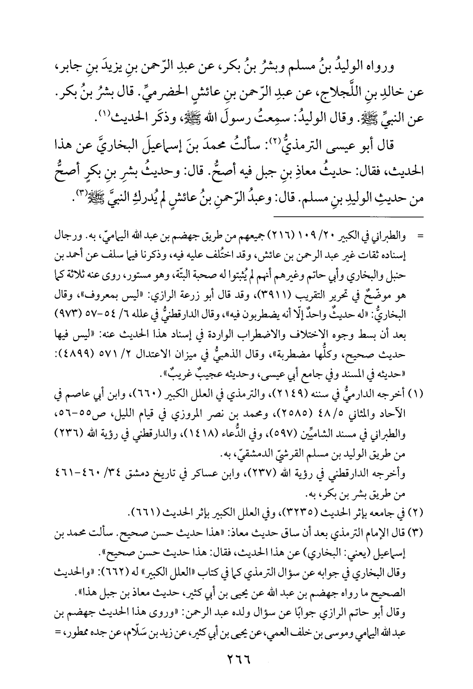 قال أبو عيسى الترمذيُّ (¬٢): سألتُ محمدَ بنَ إسماعيلَ البخاريَّ عن هذا الحديث، فقال: حديثُ معاذِ بنِ جبل فيه أصحُّ. قال: وحديثُ بشرِ بنِ بكرٍ أصحُّ من حديثِ الوليدِ بنِ مسلم. قال: وعبدُ الرّحمنِ بنُ عائشٍ لم يُدركِ النبيَّ -صلى الله عليه وسلم- (¬٣).