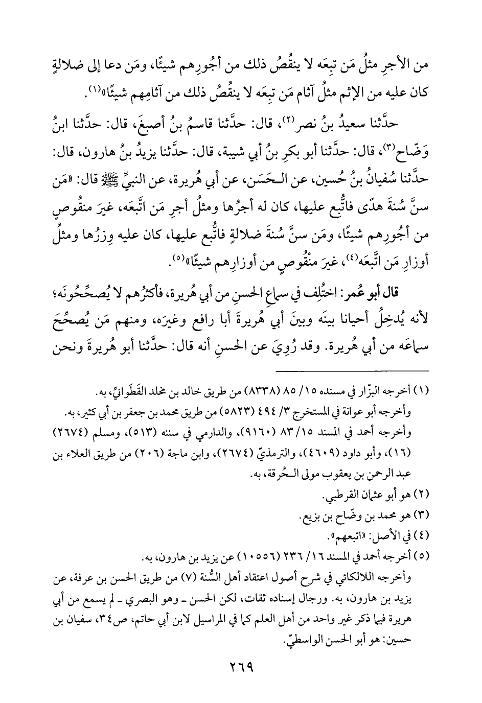 حدَّثنا سعيدُ بنُ نصر (¬٢)، قال: حدَّثنا قاسمُ بنُ أصبغَ، قال: حدَّثنا ابنُ وَضّاح (¬٣)، قال: حدَّثنا أبو بكرِ بنُ أبي شيبة، قال: حدَّثنا يزيدُ بنُ هارون، قال: حدَّثنا سُفيانُ بنُ حُسين، عن الحَسَن، عن أبي هُريرة، عن النبيِّ -صلى الله عليه وسلم- قال: "مَن سنَّ سُنةَ هدًى فاتُّبع عليها، كان له أجرُها ومثلُ أجرِ مَن اتَّبعَه، غيرَ منقُوصٍ من أجُورِهم شيئًا، ومَن سنَّ سُنةَ ضلالةٍ فاتُّبع عليها، كان عليه وِزرُها ومثلُ أوزارِ مَن اتَّبعَه (¬٤)، غيرَ منْقُوصٍ من أوزارِهم شيئًا" (¬٥).