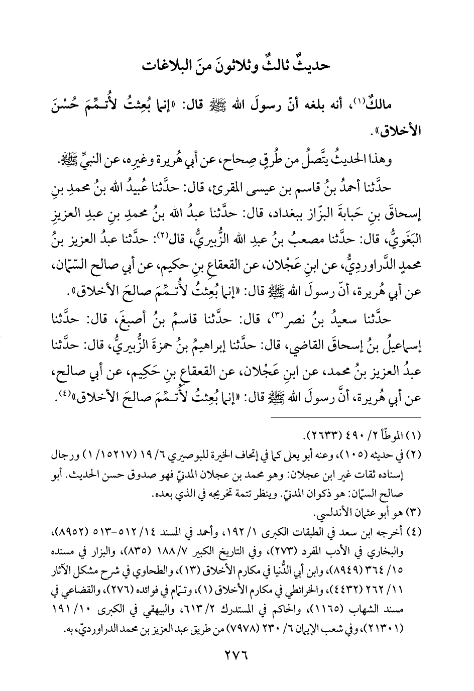 حدَّثنا أحمدُ بنُ قاسم بن عيسى المقرئ، قال: حدَّثنا عُبيدُ الله بنُ محمدِ بنِ إسحاقَ بنِ حَبابةَ البزّاز ببغداد، قال: حدَّثنا عبدُ الله بنُ محمدِ بنِ عبدِ العزيزِ البَغَويُّ، قال: حدَّثنا مصعبُ بنُ عبدِ الله الزُّبيريُّ، قال (¬٢): حدَّثنا عبدُ العزيز بنُ محمدٍ الدَّراوردِيُّ، عن ابنِ عَجْلان، عن القعقاعِ بنِ حكيم، عن أبي صالح السّمّان، عن أبي هُريرة، أنّ رسولَ الله -صلى الله عليه وسلم- قال: "إنما بُعِثتُ لأُتمِّمَ صالحَ الأخلاق".