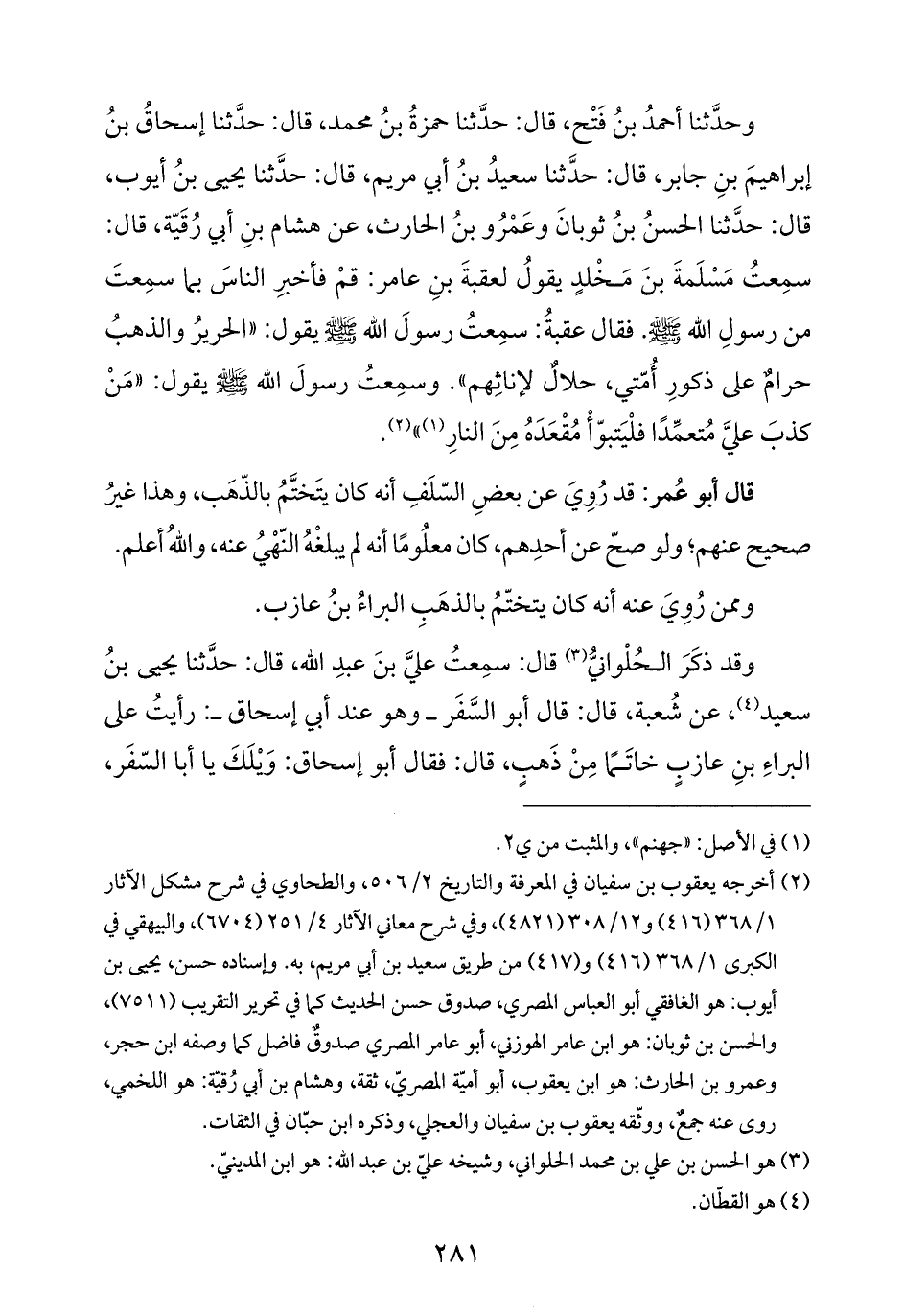 وحدَّثنا أحمدُ بنُ فَتْح، قال: حدَّثنا حمزةُ بنُ محمد، قال: حدَّثنا إسحاقُ بنُ إبراهيمَ بنِ جابر، قال: حدَّثنا سعيدُ بنُ أبي مريم، قال: حدَّثنا يحيى بنُ أيوب، قال: حدَّثنا الحسنُ بنُ ثوبانَ وعَمْرُو بنُ الحارث، عن هشام بنِ أبي رُقَيّة، قال: سمِعتُ مَسْلَمةَ بنَ مَخْلدٍ يقولُ لعقبةَ بنِ عامر: قمْ فأخبرِ الناسَ بما سمِعتَ من رسولِ الله -صلى الله عليه وسلم-. فقال عقبةُ: سمِعتُ رسولَ الله -صلى الله عليه وسلم- يقول: "الحريرُ والذهبُ حرامٌ على ذكورِ أُمّتي، حلالٌ لإناثِهم". وسمِعتُ رسولَ الله -صلى الله عليه وسلم- يقول: "مَنْ كذبَ عليَّ مُتعمِّدًا فلْيَتبوّأْ مُقْعَدَهُ مِنَ النارِ (¬١) " (¬٢).