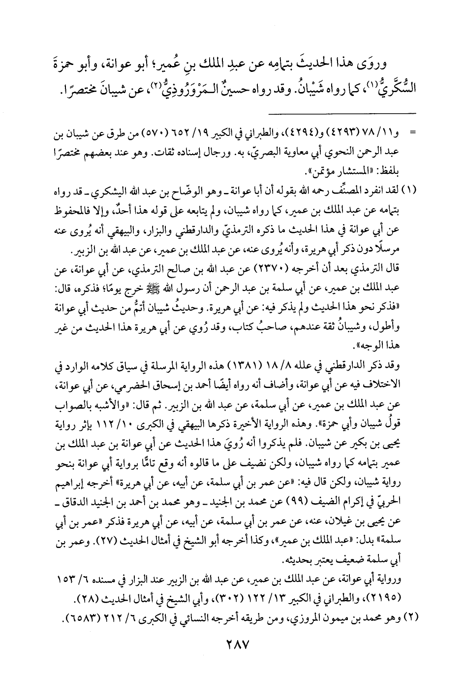 (¬١) لقد انفرد المصنِّف رحمه الله بقوله أن أبا عوانة -وهو الوضّاح بن عبد الله اليشكري- قد رواه بتمامه عن عبد الملك بن عمير، كما رواه شيبان، ولم يتابعه على قوله هذا أحدٌ، وإلا فالمحفوظ عن أبي عوانة في هذا الحديث ما ذكره الترمذيّ والدارقطني والبزار، والبيهقي أنه يُروى عنه مرسلًا دون ذكر أبي هريرة، وأنه يُروى عنه، عن عبد الملك بن عمير، عن عبد الله بن الزبير.