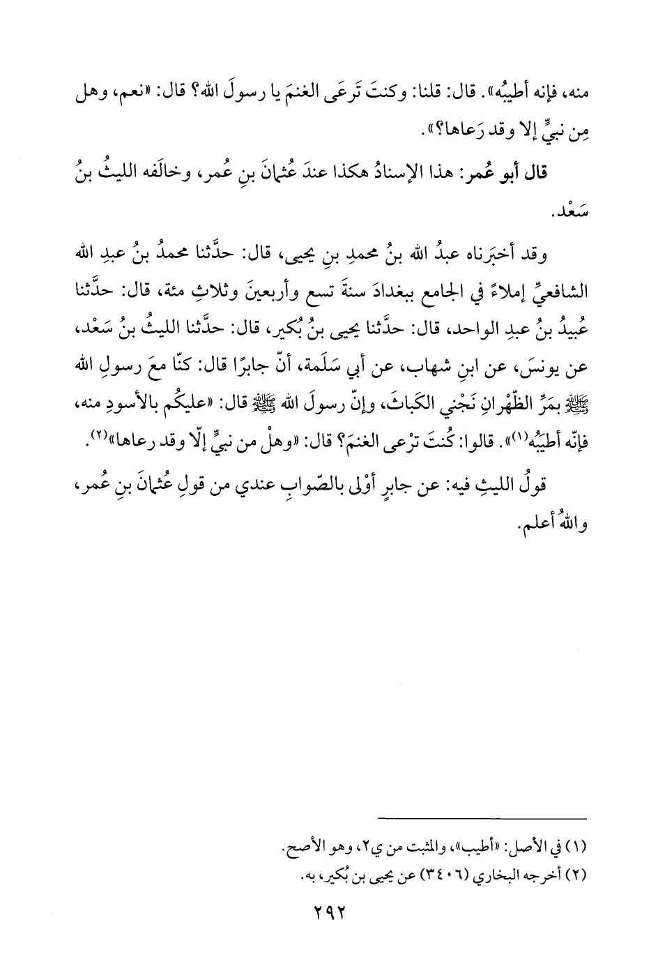 وقد أخبَرناه عبدُ الله بنُ محمدِ بنِ يحيى، قال: حدَّثنا محمدُ بنُ عبدِ الله الشافعيِّ إملاءً في الجامع ببغدادَ سنةَ تسع وأربعينَ وثلاثِ مئة، قال: حدَّثنا عُبيدُ بنُ عبدِ الواحد، قال: حدَّثنا يحيى بنُ بُكير، قال: حدَّثنا الليثُ بنُ سَعْد، عن يونسَ، عن ابنِ شهاب، عن أبي سَلَمة، أنّ جابرًا قال: كنّا معَ رسولِ الله -صلى الله عليه وسلم- بمَرِّ الظّهْرانِ نَجْني الكَباثَ، وإنّ رسولَ الله -صلى الله عليه وسلم- قال: "عليكُم بالأسودِ منه، فإنّه أطيَبُه (¬١) ". قالوا: كُنتَ ترْعى الغنمَ؟ قال: "وهلْ من نبيٍّ إلّا وقد رعاها" (¬٢).
