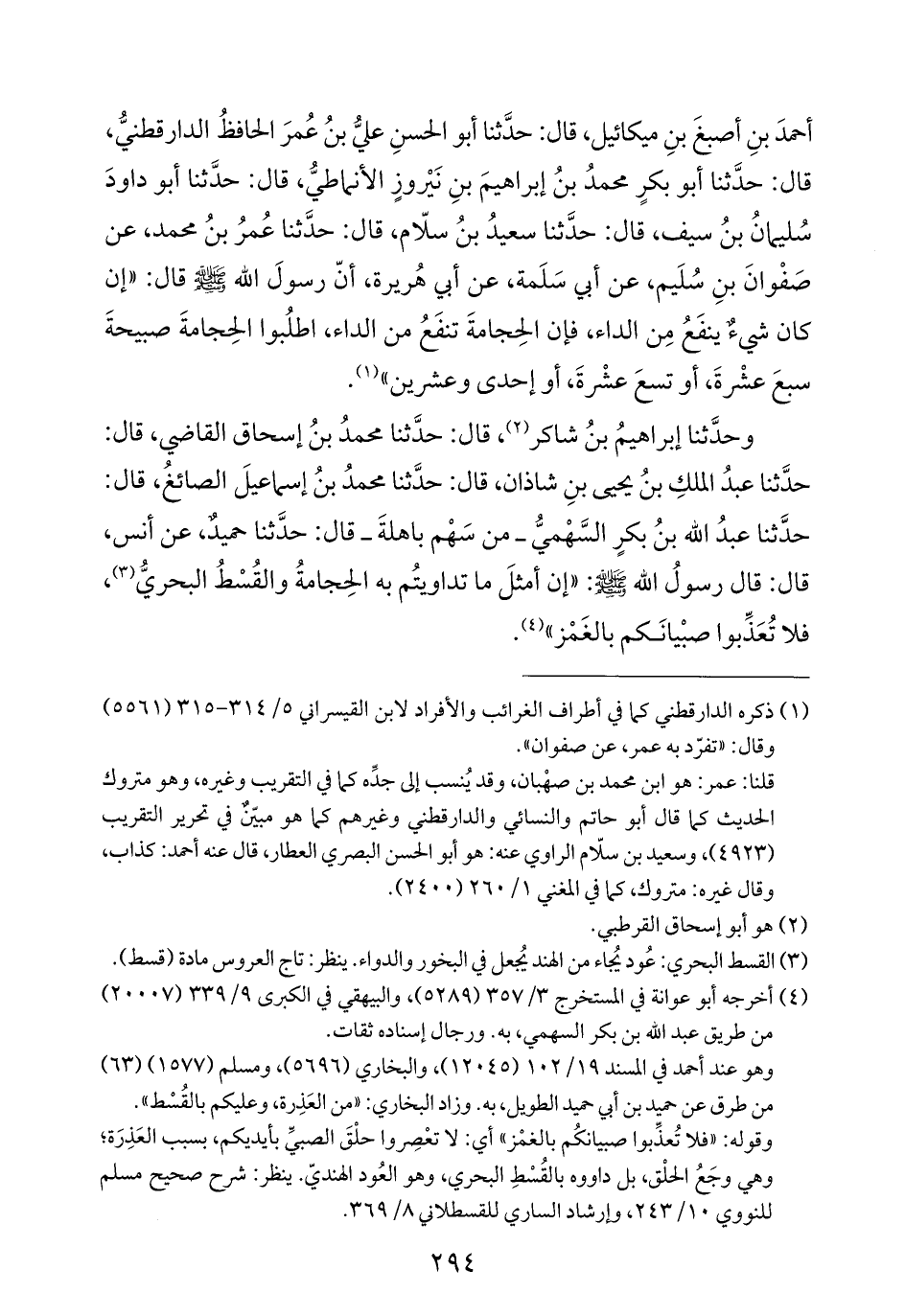 وحدَّثنا إبراهيمُ بنُ شاكر (¬٢)، قال: حدَّثنا محمدُ بنُ إسحاق القاضي، قال: حدَّثنا عبدُ الملكِ بنُ يحيى بنِ شاذان، قال: حدَّثنا محمدُ بنُ إسماعيلَ الصائغُ، قال: حدَّثنا عبدُ الله بنُ بكرٍ السَّهْميُّ -من سَهْم باهلةَ- قال: حدَّثنا حميدٌ، عن أنس، قال: قال رسولُ الله -صلى الله عليه وسلم-: "إن أمثلَ ما تداويتُم به الحِجامةُ والقُسْطُ البحريُّ (¬٣)، فلا تُعَذِّبوا صبْيانَكم بالغَمْز" (¬٤).
