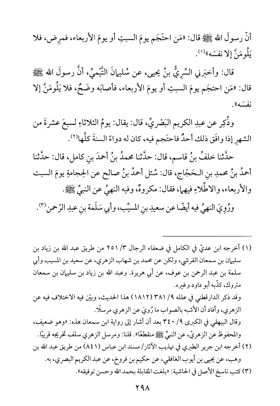 حدَّثنا خلفُ بنُ قاسم، قال: حدَّثنا محمدُ بنُ أحمدَ بنِ كامل، قال: حدَّثنا أحمدُ بنُ محمدِ بنِ الحَجّاج، قال: سُئل أحمدُ بنُ صالح عن الحِجامةِ يومَ السبت والأربعاء، والاطِّلاءِ فيهما، فقال: مكروهٌ، وفيه النهيُ عن النبيِّ -صلى الله عليه وسلم-.