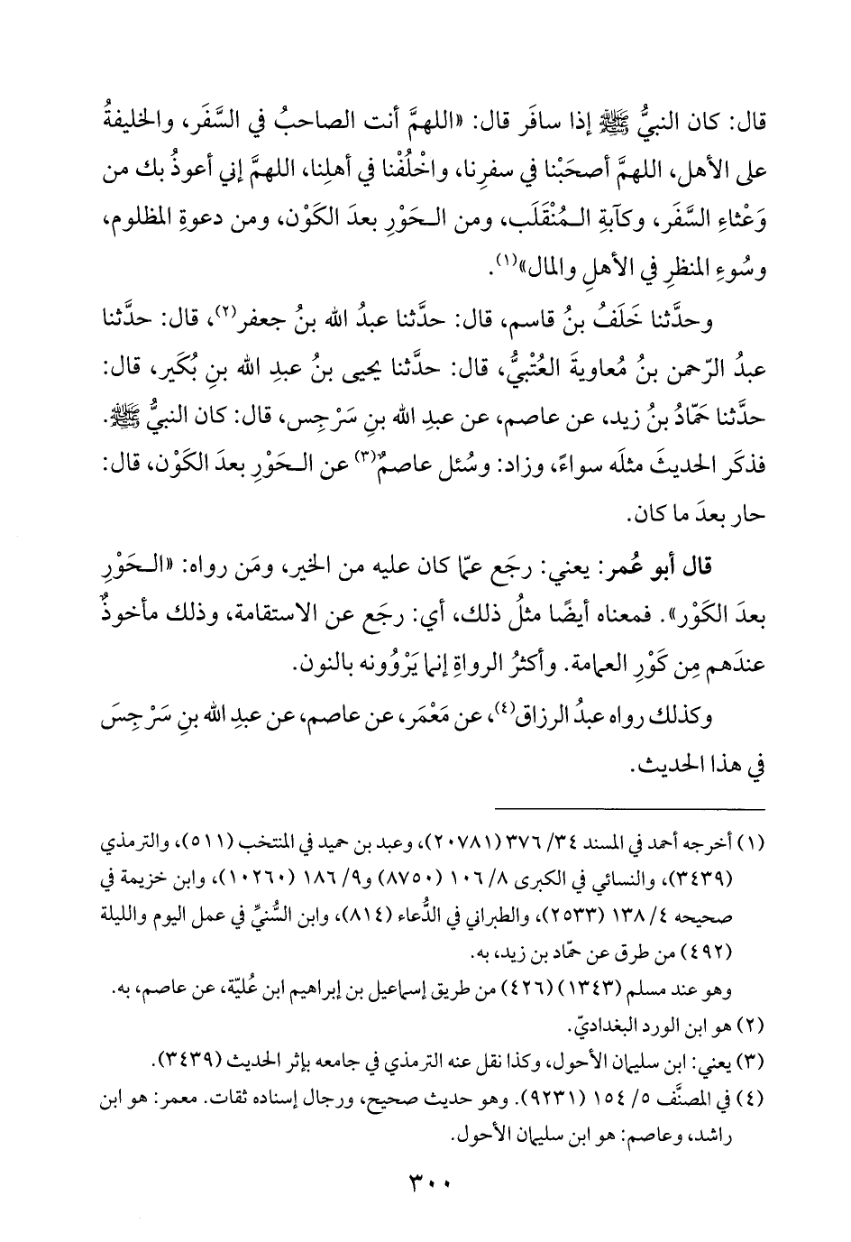 وحدَّثنا خَلَفُ بنُ قاسم، قال: حدَّثنا عبدُ الله بنُ جعفر (¬٢)، قال: حدَّثنا عبدُ الرّحمن بنُ مُعاويةَ العُتْبيُّ، قال: حدَّثنا يحيى بنُ عبدِ الله بنِ بُكَير، قال: حدَّثنا حَمّادُ بنُ زيد، عن عاصم، عن عبدِ الله بنِ سَرْجِس، قال: كان النبيُّ -صلى الله عليه وسلم-. فذكَر الحديثَ مثلَه سواءً، وزاد: وسُئل عاصمٌ (¬٣) عن الحَوْرِ بعدَ الكَوْن، قال: حار بعدَ ما كان.