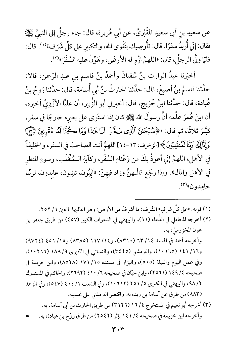 أخبَرنا عبدُ الوارث بنُ سُفيانَ وأحمدُ بنُ قاسم بنِ عبدِ الرّحمن، قالا: حدَّثنا قاسمُ بنُ أصبغَ، قال: حدَّثنا الحارثُ بنُ أبي أُسامة، قال: حدَّثنا رَوحُ بنُ عُبادة، قال: حدَّثنا ابنُ جُرَيج، قال: أخبرني أبو الزُّبير، أن عليًّا الأزْدِيَّ أخبره، أن ابنَ عُمرَ علَّمه أنَّ رسولَ الله -صلى الله عليه وسلم- كان إذا استَوى على بعيرِه خارجًا في سفر، كبَّرَ ثلاثًا، ثم قال: " {سُبْحَانَ الَّذِي سَخَّرَ لَنَا هَذَا وَمَا كُنَّا لَهُ مُقْرِنِينَ (١٣) وَإِنَّا إِلَى رَبِّنَا لَمُنْقَلِبُونَ} [الزخرف: ١٣ - ١٤] اللهمَّ أنت الصاحبُ في السفر، والخليفةُ في الأهل، اللهمَّ إنّي أعوذُ بكَ من وَعْثاءِ السَّفَر، وكآبةِ المُنْقَلَب، وسوءِ المنظرِ في الأهل والمال". وإذا رجَع قالَهنَّ وزاد فيهِنّ: "آيِبُون، تائِبون، عابِدون، لربِّنا حامِدون" (¬٣).