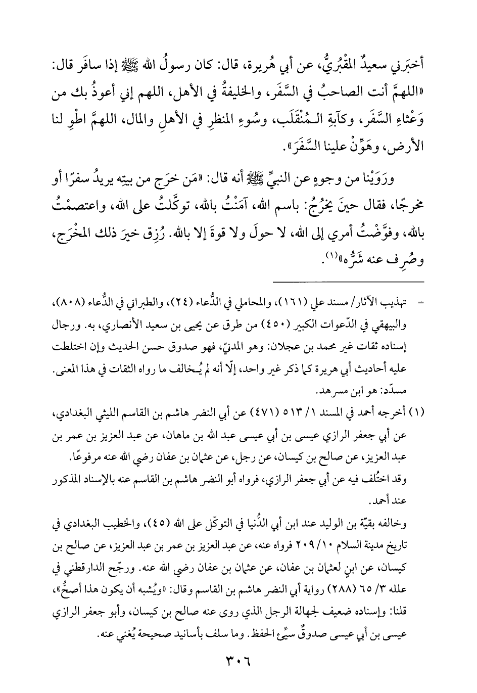 ورَوَيْنا من وجوهٍ عن النبيِّ -صلى الله عليه وسلم- أنه قال: "مَن خرَج من بيتِه يريدُ سفرًا أو مخرجًا، فقال حينَ يخرُجُ: باسم الله، آمَنْتُ بالله، توكَّلتُ على الله، واعتصمْتُ بالله، وفوَّضْتُ أمري إلى الله، لا حولَ ولا قوةَ إلا بالله. رُزِق خيرَ ذلك المخْرَج، وصُرِف عنه شَرُّه" (¬١).